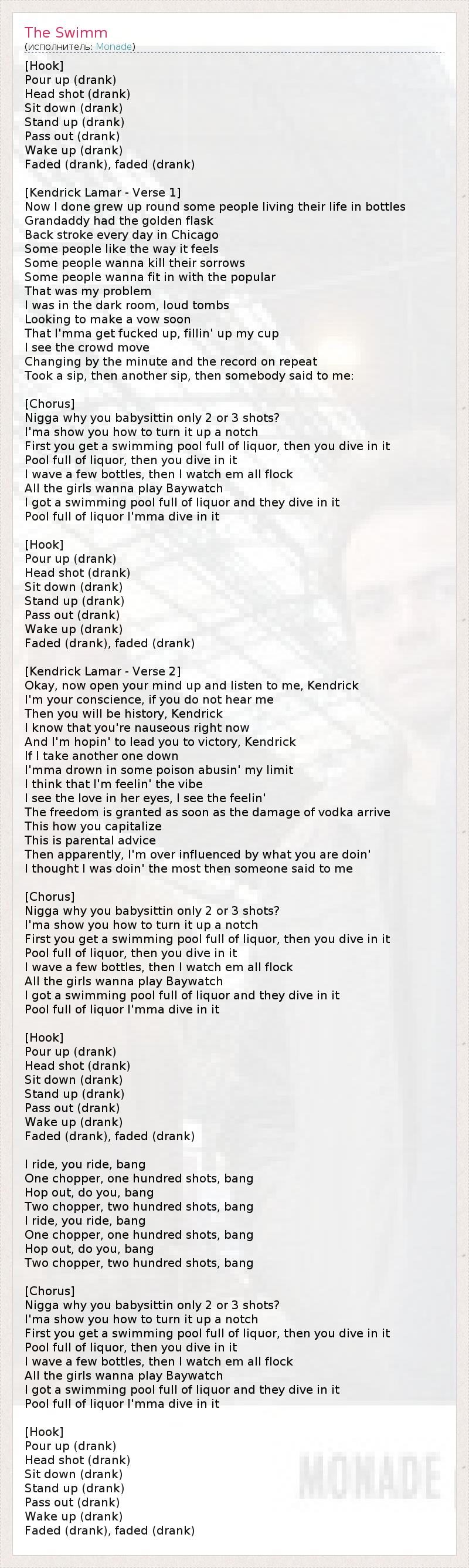 [Hook] Pour up (drank) Head shot (drank) Sit down (drank) Stand up (drank) Pass out (drank) Wake up (drank) Faded (drank), faded (drank) [Kendrick Lamar - Verse 1] Now I done grew up round some people living their life in bottles Grandaddy had the golden flask Back stroke every day in Chicago Some people like the way it feels Some people wanna kill their sorrows Some people wanna fit in with the popular That was my problem I was in the dark room, loud tombs Looking to make a vow soon That I'mma get fucked up, fillin' up my cup I see the crowd move Changing by the minute and the record on repeat Took a sip, then another sip, then somebody said to me: [Chorus] Nigga why you babysittin only 2 or 3 shots? I'ma show you how to turn it up a notch First you get a swimming pool full of liquor, then you dive in it Pool full of liquor, then you dive in it I wave a few bottles, then I watch em all flock All the girls wanna play Baywatch I got a swimming pool full of liquor and they dive in it Pool full of liquor I'mma dive in it [Hook] Pour up (drank) Head shot (drank) Sit down (drank) Stand up (drank) Pass out (drank) Wake up (drank) Faded (drank), faded (drank) [Kendrick Lamar - Verse 2] Okay, now open your mind up and listen to me, Kendrick I'm your conscience, if you do not hear me Then you will be history, Kendrick I know that you're nauseous right now And I'm hopin' to lead you to victory, Kendrick If I take another one down I'mma drown in some poison abusin' my limit I think that I'm feelin' the vibe I see the love in her eyes, I see the feelin' The freedom is granted as soon as the damage of vodka arrive This how you capitalize This is parental advice Then apparently, I'm over influenced by what you are doin' I thought I was doin' the most then someone said to me [Chorus] Nigga why you babysittin only 2 or 3 shots? I'ma show you how to turn it up a notch First you get a swimming pool full of liquor, then you dive in it Pool full of liquor, then you dive in it I wave a few bottles, then I watch em all flock All the girls wanna play Baywatch I got a swimming pool full of liquor and they dive in it Pool full of liquor I'mma dive in it [Hook] Pour up (drank) Head shot (drank) Sit down (drank) Stand up (drank) Pass out (drank) Wake up (drank) Faded (drank), faded (drank) I ride, you ride, bang One chopper, one hundred shots, bang Hop out, do you, bang Two chopper, two hundred shots, bang I ride, you ride, bang One chopper, one hundred shots, bang Hop out, do you, bang Two chopper, two hundred shots, bang [Chorus] Nigga why you babysittin only 2 or 3 shots? I'ma show you how to turn it up a notch First you get a swimming pool full of liquor, then you dive in it Pool full of liquor, then you dive in it I wave a few bottles, then I watch em all flock All the girls wanna play Baywatch I got a swimming pool full of liquor and they dive in it Pool full of liquor I'mma dive in it [Hook] Pour up (drank) Head shot (drank) Sit down (drank) Stand up (drank) Pass out (drank) Wake up (drank) Faded (drank), faded (drank)
