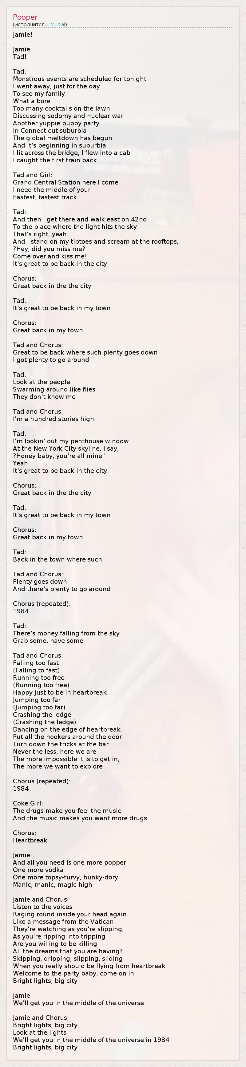 Jamie! Jamie: Tad! Tad: Monstrous events are scheduled for tonight I went away, just for the day To see my family What a bore Too many cocktails on the lawn Discussing sodomy and nuclear war Another yuppie puppy party In Connecticut suburbia The global meltdown has begun And it's beginning in suburbia I lit across the bridge, I flew into a cab I caught the first train back Tad and Girl: Grand Central Station here I come I need the middle of your Fastest, fastest track Tad: And then I get there and walk east on 42nd To the place where the light hits the sky That's right, yeah And I stand on my tiptoes and scream at the rooftops, ?Hey, did you miss me? Come over and kiss me!' It's great to be back in the city Chorus: Great back in the the city Tad: It's great to be back in my town Chorus: Great back in my town Tad and Chorus: Great to be back where such plenty goes down I got plenty to go around Tad: Look at the people Swarming around like flies They don't know me Tad and Chorus: I'm a hundred stories high Tad: I'm lookin' out my penthouse window At the New York City skyline, I say, ?Honey baby, you're all mine.' Yeah It's great to be back in the city Chorus: Great back in the the city Tad: It's great to be back in my town Chorus: Great back in my town Tad: Back in the town where such Tad and Chorus: Plenty goes down And there's plenty to go around Chorus (repeated): 1984 Tad: There's money falling from the sky Grab some, have some Tad and Chorus: Falling too fast (Falling to fast) Running too free (Running too free) Happy just to be in heartbreak Jumping too far (Jumping too far) Crashing the ledge (Crashing the ledge) Dancing on the edge of heartbreak Put all the hookers around the door Turn down the tricks at the bar Never the less, here we are The more impossible it is to get in, The more we want to explore Chorus (repeated): 1984 Coke Girl: The drugs make you feel the music And the music makes you want more drugs Chorus: Heartbreak Jamie: And all you need is one more popper One more vodka One more topsy-turvy, hunky-dory Manic, manic, magic high Jamie and Chorus: Listen to the voices Raging round inside your head again Like a message from the Vatican They're watching as you're slipping, As you're ripping into tripping Are you willing to be killing All the dreams that you are having? Skipping, dripping, slipping, sliding When you really should be flying from heartbreak Welcome to the party baby, come on in Bright lights, big city Jamie: We'll get you in the middle of the universe Jamie and Chorus: Bright lights, big city Look at the lights We'll get you in the middle of the universe in 1984 Bright lights, big city
