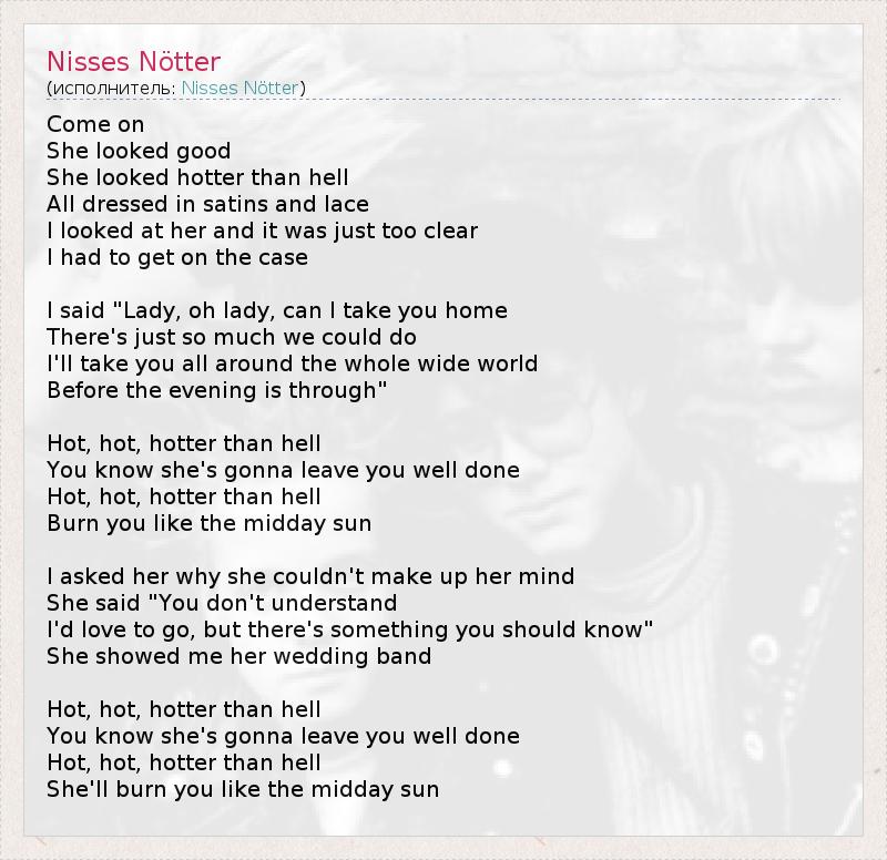 Come on She looked good She looked hotter than hell All dressed in satins and lace I looked at her and it was just too clear I had to get on the case I said "Lady, oh lady, can I take you home There's just so much we could do I'll take you all around the whole wide world Before the evening is through" Hot, hot, hotter than hell You know she's gonna leave you well done Hot, hot, hotter than hell Burn you like the midday sun I asked her why she couldn't make up her mind She said "You don't understand I'd love to go, but there's something you should know" She showed me her wedding band Hot, hot, hotter than hell You know she's gonna leave you well done Hot, hot, hotter than hell She'll burn you like the midday sun