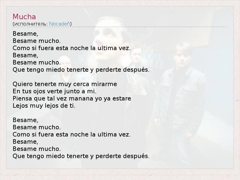 Besame, Besame mucho. Como si fuera esta noche la ultima vez. Besame, Besame mucho. Que tengo miedo tenerte y perderte después. Quiero tenerte muy cerca mirarme En tus ojos verte junto a mi. Piensa que tal vez manana yo ya estare Lejos muy lejos de ti. Besame, Besame mucho. Como si fuera esta noche la ultima vez. Besame, Besame mucho. Que tengo miedo tenerte y perderte después.