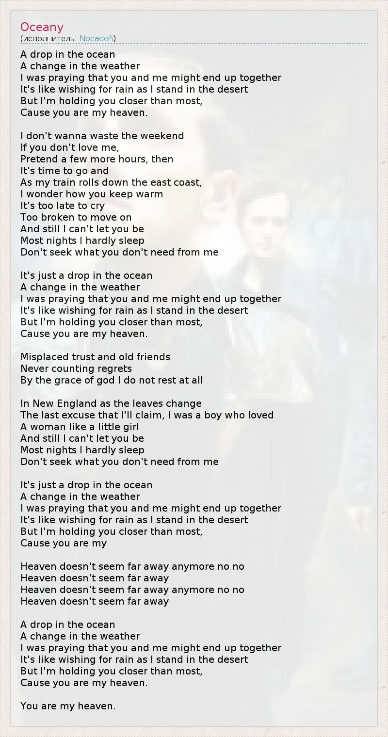 A drop in the ocean A change in the weather I was praying that you and me might end up together It's like wishing for rain as I stand in the desert But I'm holding you closer than most, Cause you are my heaven. I don't wanna waste the weekend If you don't love me, Pretend a few more hours, then It's time to go and As my train rolls down the east coast, I wonder how you keep warm It's too late to cry Too broken to move on And still I can't let you be Most nights I hardly sleep Don't seek what you don't need from me It's just a drop in the ocean A change in the weather I was praying that you and me might end up together It's like wishing for rain as I stand in the desert But I'm holding you closer than most, Cause you are my heaven. Misplaced trust and old friends Never counting regrets By the grace of god I do not rest at all In New England as the leaves change The last excuse that I'll claim, I was a boy who loved A woman like a little girl And still I can't let you be Most nights I hardly sleep Don't seek what you don't need from me It's just a drop in the ocean A change in the weather I was praying that you and me might end up together It's like wishing for rain as I stand in the desert But I'm holding you closer than most, Cause you are my Heaven doesn't seem far away anymore no no Heaven doesn't seem far away Heaven doesn't seem far away anymore no no Heaven doesn't seem far away A drop in the ocean A change in the weather I was praying that you and me might end up together It's like wishing for rain as I stand in the desert But I'm holding you closer than most, Cause you are my heaven. You are my heaven.