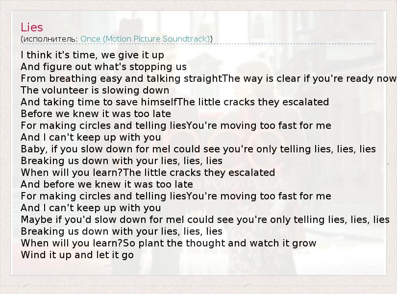 I think it's time, we give it up And figure out what's stopping us From breathing easy and talking straightThe way is clear if you're ready now The volunteer is slowing down And taking time to save himselfThe little cracks they escalated Before we knew it was too late For making circles and telling liesYou're moving too fast for me And I can't keep up with you Baby, if you slow down for meI could see you're only telling lies, lies, lies Breaking us down with your lies, lies, lies When will you learn?The little cracks they escalated And before we knew it was too late For making circles and telling liesYou're moving too fast for me And I can't keep up with you Maybe if you'd slow down for meI could see you're only telling lies, lies, lies Breaking us down with your lies, lies, lies When will you learn?So plant the thought and watch it grow Wind it up and let it go