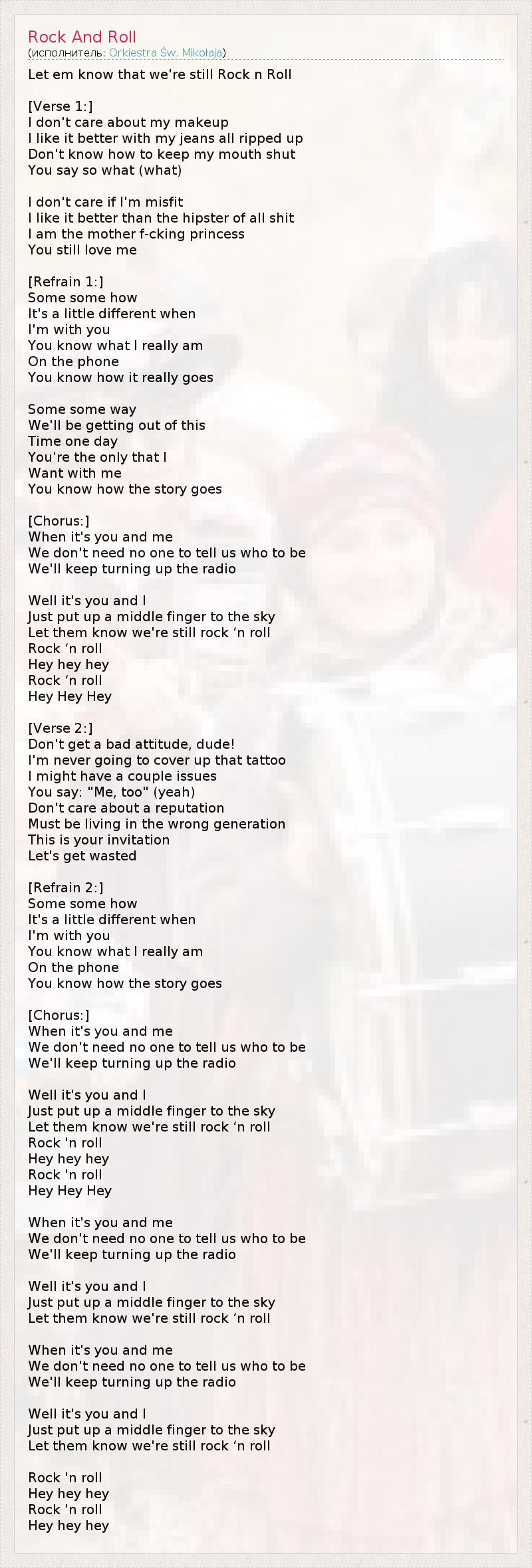 Let em know that we're still Rock n Roll [Verse 1:] I don't care about my makeup I like it better with my jeans all ripped up Don't know how to keep my mouth shut You say so what (what) I don't care if I'm misfit I like it better than the hipster of all shit I am the mother f-cking princess You still love me [Refrain 1:] Some some how It's a little different when I'm with you You know what I really am On the phone You know how it really goes Some some way We'll be getting out of this Time one day You're the only that I Want with me You know how the story goes [Chorus:] When it's you and me We don't need no one to tell us who to be We'll keep turning up the radio Well it's you and I Just put up a middle finger to the sky Let them know we're still rock ‘n roll Rock ‘n roll Hey hey hey Rock ‘n roll Hey Hey Hey [Verse 2:] Don't get a bad attitude, dude! I'm never going to cover up that tattoo I might have a couple issues You say: "Me, too" (yeah) Don't care about a reputation Must be living in the wrong generation This is your invitation Let's get wasted [Refrain 2:] Some some how It's a little different when I'm with you You know what I really am On the phone You know how the story goes [Chorus:] When it's you and me We don't need no one to tell us who to be We'll keep turning up the radio Well it's you and I Just put up a middle finger to the sky Let them know we're still rock ‘n roll Rock 'n roll Hey hey hey Rock 'n roll Hey Hey Hey When it's you and me We don't need no one to tell us who to be We'll keep turning up the radio Well it's you and I Just put up a middle finger to the sky Let them know we're still rock ‘n roll When it's you and me We don't need no one to tell us who to be We'll keep turning up the radio Well it's you and I Just put up a middle finger to the sky Let them know we're still rock ‘n roll Rock 'n roll Hey hey hey Rock 'n roll Hey hey hey