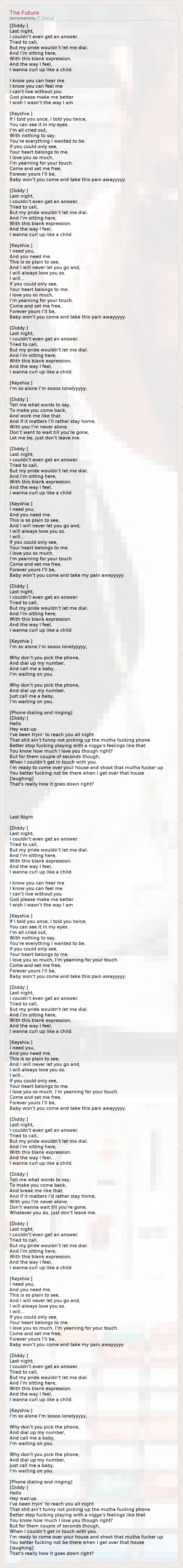 [Diddy:] Той ночью Я не мог получить ответа, Позвонить хотел, Но мне гордость не дала... И сижу я здесь Совсем опустошённый, На душе так пусто, Что мне хочется кричать... Я знаю, ты слышишь меня, Я знаю, ты чувствуешь меня, Я не могу без тебя... Боже, пожалуйста, помоги мне! Мне так тяжело... [Keyshia:] Я сказала раз, сказала два... Слышишь ты мои слова? Я огорчена, Мне нечего сказать, Я так хочу к тебе опять! Только видеть бы ты мог, Как тронуть меня смог, Я так тебя люблю, Без тебя я не могу! Приди, освободи Пожар в моей груди! Когда же ты придёшь и боль мою сотрёшь?.. [Diddy:] Той ночью Я не мог получить ответа, Позвонить хотел, Но мне гордость не дала... И сижу я здесь Совсем опустошённый, На душе так пусто, Что мне хочется кричать... [Keyshia:] Я нужна тебе, Ты нужен мне, Это же так очевидно! Я не брошу тебя ни за что, Я буду любить, несмотря ни на что, Вот так... Только видеть бы ты мог, Как тронуть меня смог, Я так тебя люблю, Без тебя я не могу! Приди, освободи Пожар в моей груди! Когда же ты придёшь и боль мою сотрёшь?.. [Diddy:] Той ночью Я не мог получить ответа, Позвонить хотел, Но мне гордость не дала... И сижу я здесь Совсем опустошённый, На душе так пусто, Что мне хочется кричать... [Keyshia:] Я одна, я совсем одна!.. [Diddy:] Скажи мне, как повернуть Всё, что было, вспять, Заново начать? И если надо, всё будет, как хочешь, Нашу любовь не затопчешь! Мы же с тобой будем рядом, Правда, детка? Я и ты!.. [Diddy:] Той ночью Я не мог получить ответа, Позвонить хотел, Но мне гордость не дала... И сижу я здесь Совсем опустошённый, На душе так пусто, Что мне хочется кричать... [Keyshia:] Я нужна тебе, Ты нужен мне, Это же так очевидно! Я не брошу тебя ни за что, Я буду любить, несмотря ни на что, Вот так... Только видеть бы ты мог, Как тронуть меня смог, Я так тебя люблю, Без тебя я не могу! Приди, освободи Пожар в моей груди! Когда же ты придёшь и боль мою сотрёшь?.. [Diddy:] Той ночью Я не мог получить ответа, Позвонить хотел, Но мне гордость не дала... И сижу я здесь Совсем опустошённый, На душе так пусто, Что мне хочется кричать... [Keyshia:] Я одна, я совсем одна!.. Любимый, трубку возьми, Мой номер набери И мне позвони, Я так тебя жду! Любимый, трубку возьми, Мой номер набери И мне позвони, Я так тебя жду! [Звук набора номера и звонка] [Diddy:] Привет! Эй, что случилось? Я пытался дозвониться до тебя всю ночь. Ни черта не весело то, что ты не брала этот чёртов телефон! Хватит уже играть с моими чувствами! Ты же ведь знаешь, как сильно я тебя люблю, правда? Нелегко мне далось это ожидание, И пока я не мог дозвониться до тебя, Я был готов приехать к тебе и раздолбать к чертям этот аппарат! Лучше тебе там не быть, когда я приеду к тебе. [смех] Вот, значит, как у нас идут дела? * поэтический перевод Прошлой ночью (перевод) [Diddy:] Прошлой ночью Я так и не получил ответа. Я пытался позвонить, Но гордость не позволяла мне набрать твой номер. Теперь я сижу, Бессмысленно глядя в пустоту, И мне очень хочется Свернуться клубочком. Я знаю, что ты меня слышишь, Я знаю, что ты меня чувствуешь, Я не могу жить без тебя. Боже, прошу, сделай меня лучше, Я не хочу быть таким, какой есть... [Keyshia:] Если я сказала тебе о чём-то, значит, я именно это имела в виду – Посмотри мне в глаза, и ты всё поймёшь. Я выбилась из сил, И мне больше нечего сказать. Я всегда мечтала о мужчине, точь-в-точь как ты. Если бы ты только понял – Моё сердце принадлежит тебе. Я так сильно люблю тебя, я жажду твоего прикосновения. Приди и осв