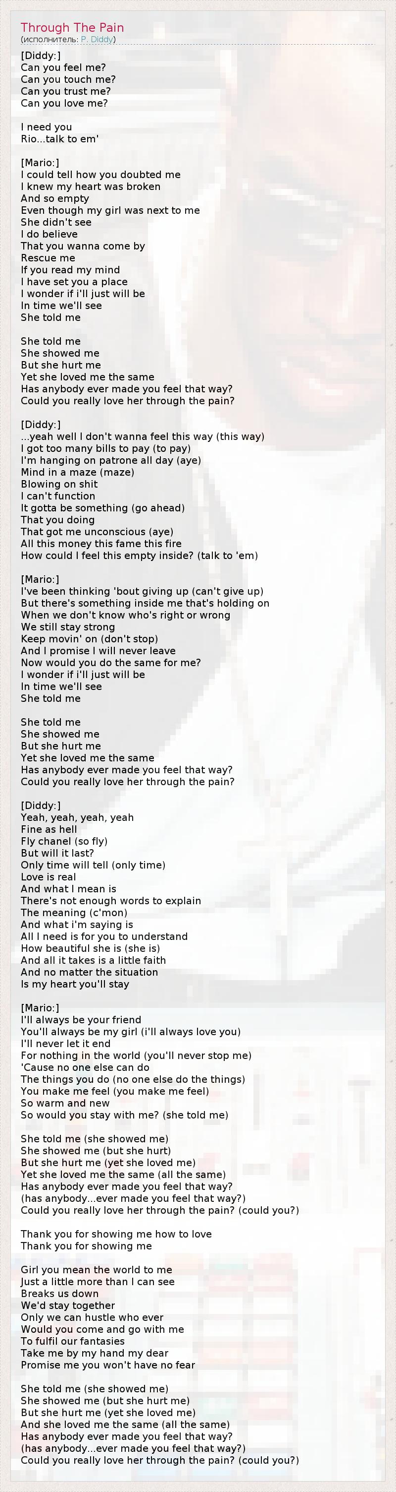[Diddy:] Ты можешь почувствовать меня? Ты можешь дотронуться до меня? Ты можешь довериться мне? Ты можешь любить меня? Ты нужна мне Рио... Поговори с ними... [Mario:] Я мог бы сказать, как ты волновала меня Я знал, что мое сердце разбито И так пусто Несмотря на это моя девушка была рядом со мной Но она не видела Но я верю Что ты хочешь прийти И спасти меня Если ты читаешь мои мысли Я освобожу место для тебя Я задаюсь вопросом, буду ли я Со временем станет ясно Она сказала мне Она сказала мне Она показала мне Но она ранила меня Она так же любила меня Кто-либо заставлял тебя чувствовать так же Сможешь ли ты любить ее сквозь боль [Diddy:] Мда, я не хочу чувствовать себя таким образом (таким образом) За мной много осталось долгов (долгов) Я кручусь, как белка в колесе, целый день Я запутался Зарылся по уши в неприятностях* Я не могу работать Ведь должно быть что-то Что ты делаешь И чего я не могу понять Все эти деньги, эта известность, этот огонь Как я мог чувствовать эту пустоту внутри? [Mario:] Я думал о том, как бы сдаться (нельзя сдаваться) Но внутри меня есть что-то, что сдерживает меня Когда мы не знаем кто прав, а кто виноват Мы будем сильными Будем двигаться вперед (не останавливаясь) И я обещаю, я никогда не отступлюсь А ты сможешь сделать то же для меня? Я задаюсь вопросом, буду ли я Со временем станет ясно Она сказала мне Она сказала мне Она показала мне Но она ранила меня Она так же любила меня Кто-либо заставлял тебя чувствовать так же Сможешь ли ты любить ее сквозь боль [Diddy:] Да, да, да, да Горячо как в аду Лети Шанель (Так лети) Но продлится ли это? Время покажет (только время) Любовь искренняя И то, что имею ввиду Не хватит слов, чтоб описать Смысл (давай) И то, что я говорю Все, что мне нужно для того, чтобы понять Как она прекрасна (прекрасна) И все, что нужно – это немного веры И независимо от ситуации Ты останешься в моем сердце [Mario:] Я всегда буду тебе другом Ты всегда будешь моей девочкой (Я всегда буду любить тебя) Я не позволю этому окончиться Ни за что на свете (ты не остановишь меня) И никто не сможет Все, что ты делаешь, (никто так не делает) Приводит меня к чувству (приводит меня к чувству) Тепла и новшества Ты хочешь остаться со мной? (Она сказала) Она сказала мне (Она показала мне) Она по показала мне (Но она ранила меня) Но она ранила меня (Да, она любила) Она любила меня так же (так же) Кто-нибудь заставлял чувствовать тебя то же? (Кто-нибудь заставлял когда-либо чувствовать тебя то же?) Сможешь ли ты любить ее сквозь боль (Сможешь?) Спасибо за то, что показала как любить Спасибо за то, что показала Девочка, ты мне дорога как Мир Только то, чего я не могу видеть Раскалывает нас Мы остались бы Вместе Только вместе мы сможем добиться того, чего никто не смог. Ты придешь, чтобы Осуществить наши фантазии Возьми меня за руку, дорогая Обещай, что ты не испугаешься Она сказала мне (Она показала мне) Она показала мне (Но она ранила меня) Но она ранила меня (Да, она любила) Она любила меня так же (так же) Кто-нибудь заставлял чувствовать тебя то же? (Кто-нибудь заставлял когда-либо чувствовать тебя то же?) Сможешь ли ты любить ее сквозь боль (Сможешь?)