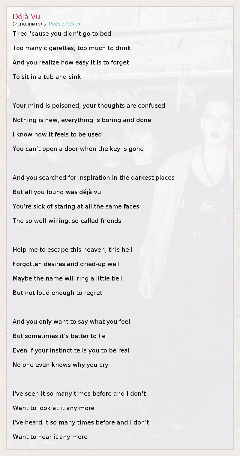 Tired 'cause you didn't go to bed Too many cigarettes, too much to drink And you realize how easy it is to forget To sit in a tub and sink Your mind is poisoned, your thoughts are confused Nothing is new, everything is boring and done I know how it feels to be used You can't open a door when the key is gone And you searched for inspiration in the darkest places But all you found was déjà vu You're sick of staring at all the same faces The so well-willing, so-called friends Help me to escape this heaven, this hell Forgotten desires and dried-up well Maybe the name will ring a little bell But not loud enough to regret And you only want to say what you feel But sometimes it's better to lie Even if your instinct tells you to be real No one even knows why you cry I've seen it so many times before and I don't Want to look at it any more I've heard it so many times before and I don't Want to hear it any more