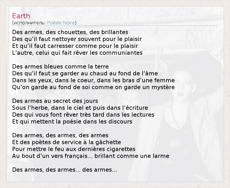 Оружие, красивое, блестящее, Одно для того, чтобы его чистили ради забавы, И чтобы о нем заботились, как ради забавы, Другое является мечтой причастниц. Оружие, синее как земля, То, что нужно хранить в тепле, в глубине души, В глазах, в сердце, в руках женщины, Его хранят у себя, как хранят тайну. Оружие, в тайне дней, Под травой, в небе и даже в письмах, То, о чем вы мечтаете в самом конце чтения, И то, что создает поэзию. Оружие, оружие, оружие, И поэты на службе у спусковых крючков, Чтобы зажечь последнюю сигарету, В конце французского стиха, блестящего, как слеза. Оружие, оружие... оружие...