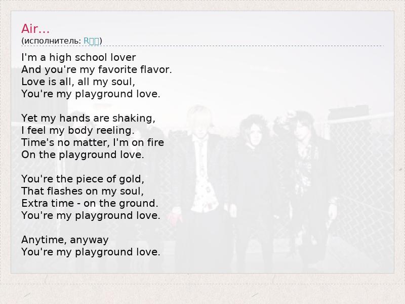 I'm a high school lover And you're my favorite flavor. Love is all, all my soul, You're my playground love. Yet my hands are shaking, I feel my body reeling. Time's no matter, I'm on fire On the playground love. You're the piece of gold, That flashes on my soul, Extra time - on the ground. You're my playground love. Anytime, anyway You're my playground love.