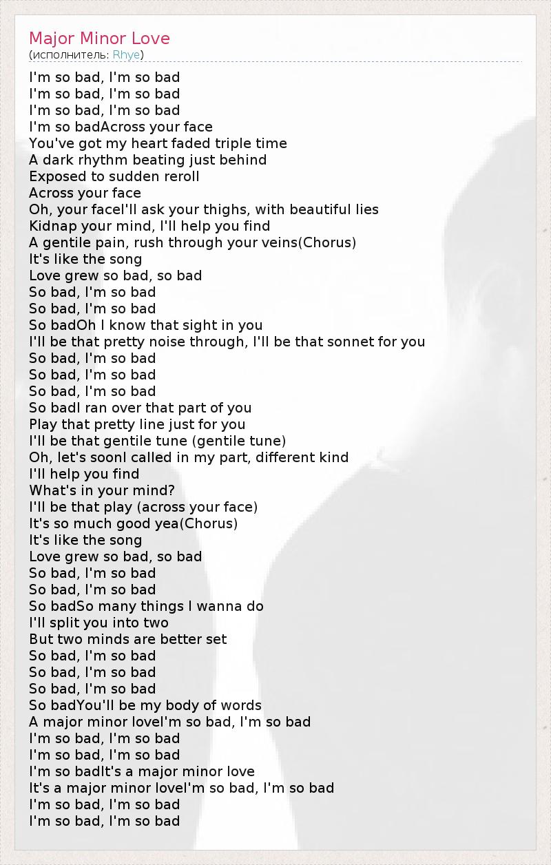 I'm so bad, I'm so bad I'm so bad, I'm so bad I'm so bad, I'm so bad I'm so badAcross your face You've got my heart faded triple time A dark rhythm beating just behind Exposed to sudden reroll Across your face Oh, your faceI'll ask your thighs, with beautiful lies Kidnap your mind, I'll help you find A gentile pain, rush through your veins(Chorus) It's like the song Love grew so bad, so bad So bad, I'm so bad So bad, I'm so bad So badOh I know that sight in you I'll be that pretty noise through, I'll be that sonnet for you So bad, I'm so bad So bad, I'm so bad So bad, I'm so bad So badI ran over that part of you Play that pretty line just for you I'll be that gentile tune (gentile tune) Oh, let's soonI called in my part, different kind I'll help you find What's in your mind? I'll be that play (across your face) It's so much good yea(Chorus) It's like the song Love grew so bad, so bad So bad, I'm so bad So bad, I'm so bad So badSo many things I wanna do I'll split you into two But two minds are better set So bad, I'm so bad So bad, I'm so bad So bad, I'm so bad So badYou'll be my body of words A major minor loveI'm so bad, I'm so bad I'm so bad, I'm so bad I'm so bad, I'm so bad I'm so badIt's a major minor love It's a major minor loveI'm so bad, I'm so bad I'm so bad, I'm so bad I'm so bad, I'm so bad
