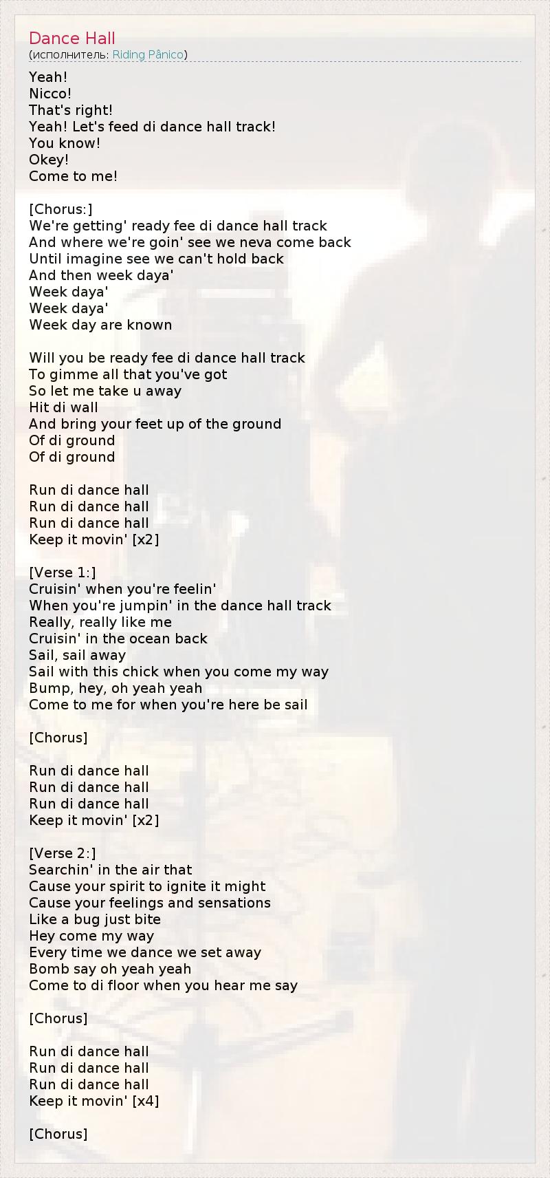 Yeah! Nicco! That's right! Yeah! Let's feed di dance hall track! You know! Okey! Come to me! [Chorus:] We're getting' ready fee di dance hall track And where we're goin' see we neva come back Until imagine see we can't hold back And then week daya' Week daya' Week daya' Week day are known Will you be ready fee di dance hall track To gimme all that you've got So let me take u away Hit di wall And bring your feet up of the ground Of di ground Of di ground Run di dance hall Run di dance hall Run di dance hall Keep it movin' [x2] [Verse 1:] Cruisin' when you're feelin' When you're jumpin' in the dance hall track Really, really like me Cruisin' in the ocean back Sail, sail away Sail with this chick when you come my way Bump, hey, oh yeah yeah Come to me for when you're here be sail [Chorus] Run di dance hall Run di dance hall Run di dance hall Keep it movin' [x2] [Verse 2:] Searchin' in the air that Cause your spirit to ignite it might Cause your feelings and sensations Like a bug just bite Hey come my way Every time we dance we set away Bomb say oh yeah yeah Come to di floor when you hear me say [Chorus] Run di dance hall Run di dance hall Run di dance hall Keep it movin' [x4] [Chorus]