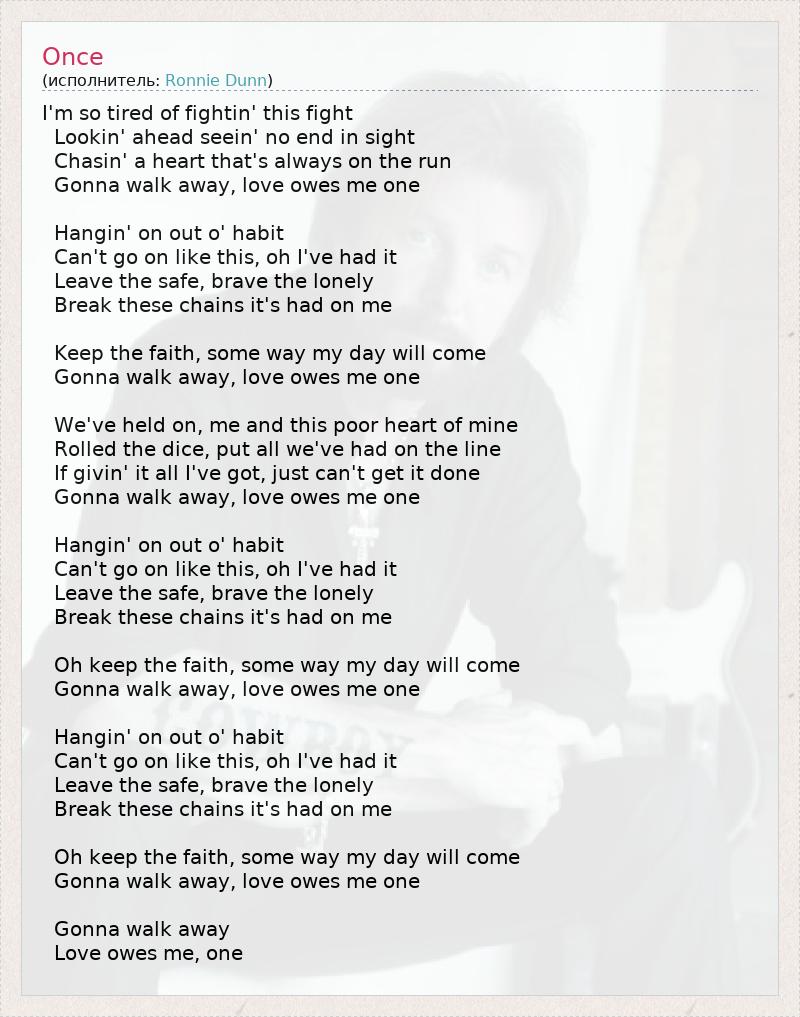 I'm so tired of fightin' this fight Lookin' ahead seein' no end in sight Chasin' a heart that's always on the run Gonna walk away, love owes me one Hangin' on out o' habit Can't go on like this, oh I've had it Leave the safe, brave the lonely Break these chains it's had on me Keep the faith, some way my day will come Gonna walk away, love owes me one We've held on, me and this poor heart of mine Rolled the dice, put all we've had on the line If givin' it all I've got, just can't get it done Gonna walk away, love owes me one Hangin' on out o' habit Can't go on like this, oh I've had it Leave the safe, brave the lonely Break these chains it's had on me Oh keep the faith, some way my day will come Gonna walk away, love owes me one Hangin' on out o' habit Can't go on like this, oh I've had it Leave the safe, brave the lonely Break these chains it's had on me Oh keep the faith, some way my day will come Gonna walk away, love owes me one Gonna walk away Love owes me, one