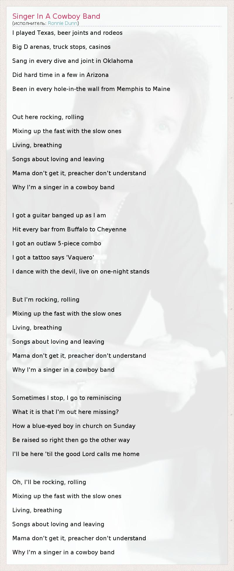 I played Texas, beer joints and rodeos Big D arenas, truck stops, casinos Sang in every dive and joint in Oklahoma Did hard time in a few in Arizona Been in every hole-in-the wall from Memphis to Maine Out here rocking, rolling Mixing up the fast with the slow ones Living, breathing Songs about loving and leaving Mama don't get it, preacher don't understand Why I'm a singer in a cowboy band I got a guitar banged up as I am Hit every bar from Buffalo to Cheyenne I got an outlaw 5-piece combo I got a tattoo says 'Vaquero' I dance with the devil, live on one-night stands But I'm rocking, rolling Mixing up the fast with the slow ones Living, breathing Songs about loving and leaving Mama don't get it, preacher don't understand Why I'm a singer in a cowboy band Sometimes I stop, I go to reminiscing What it is that I'm out here missing? How a blue-eyed boy in church on Sunday Be raised so right then go the other way I'll be here 'til the good Lord calls me home Oh, I'll be rocking, rolling Mixing up the fast with the slow ones Living, breathing Songs about loving and leaving Mama don't get it, preacher don't understand Why I'm a singer in a cowboy band