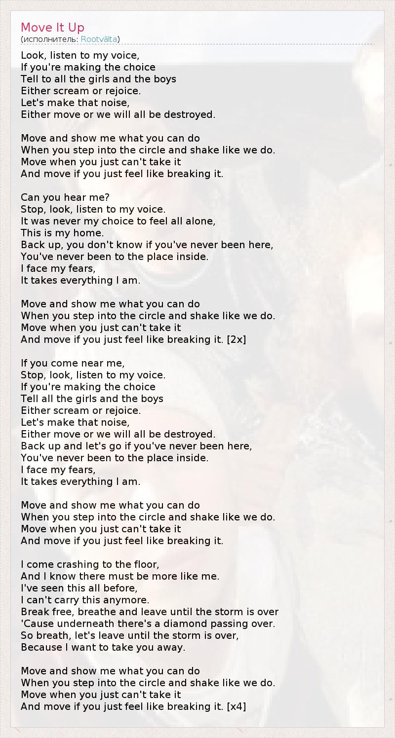 Look, listen to my voice, If you're making the choice Tell to all the girls and the boys Either scream or rejoice. Let's make that noise, Either move or we will all be destroyed. Move and show me what you can do When you step into the circle and shake like we do. Move when you just can't take it And move if you just feel like breaking it. Can you hear me? Stop, look, listen to my voice. It was never my choice to feel all alone, This is my home. Back up, you don't know if you've never been here, You've never been to the place inside. I face my fears, It takes everything I am. Move and show me what you can do When you step into the circle and shake like we do. Move when you just can't take it And move if you just feel like breaking it. [2x] If you come near me, Stop, look, listen to my voice. If you're making the choice Tell all the girls and the boys Either scream or rejoice. Let's make that noise, Either move or we will all be destroyed. Back up and let's go if you've never been here, You've never been to the place inside. I face my fears, It takes everything I am. Move and show me what you can do When you step into the circle and shake like we do. Move when you just can't take it And move if you just feel like breaking it. I come crashing to the floor, And I know there must be more like me. I've seen this all before, I can't carry this anymore. Break free, breathe and leave until the storm is over 'Cause underneath there's a diamond passing over. So breath, let's leave until the storm is over, Because I want to take you away. Move and show me what you can do When you step into the circle and shake like we do. Move when you just can't take it And move if you just feel like breaking it. [x4]