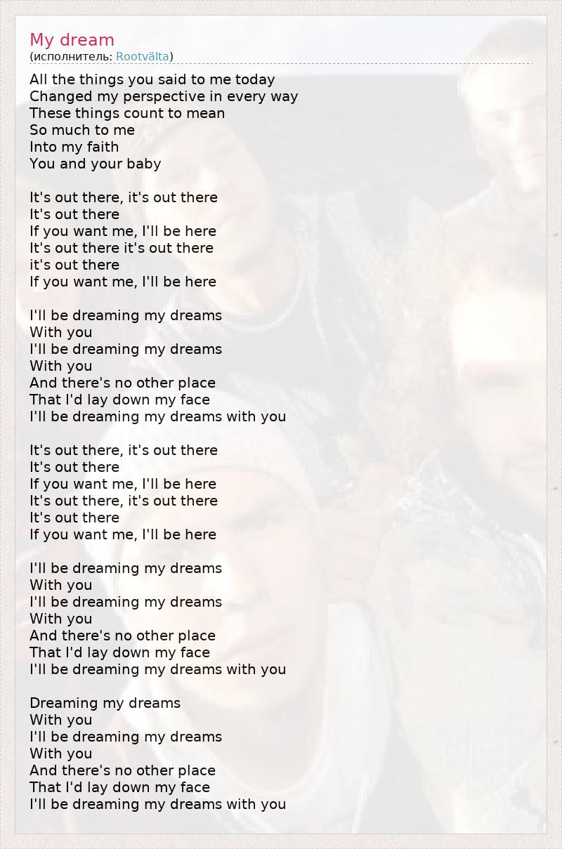 All the things you said to me today Changed my perspective in every way These things count to mean So much to me Into my faith You and your baby It's out there, it's out there It's out there If you want me, I'll be here It's out there it's out there it's out there If you want me, I'll be here I'll be dreaming my dreams With you I'll be dreaming my dreams With you And there's no other place That I'd lay down my face I'll be dreaming my dreams with you It's out there, it's out there It's out there If you want me, I'll be here It's out there, it's out there It's out there If you want me, I'll be here I'll be dreaming my dreams With you I'll be dreaming my dreams With you And there's no other place That I'd lay down my face I'll be dreaming my dreams with you Dreaming my dreams With you I'll be dreaming my dreams With you And there's no other place That I'd lay down my face I'll be dreaming my dreams with you