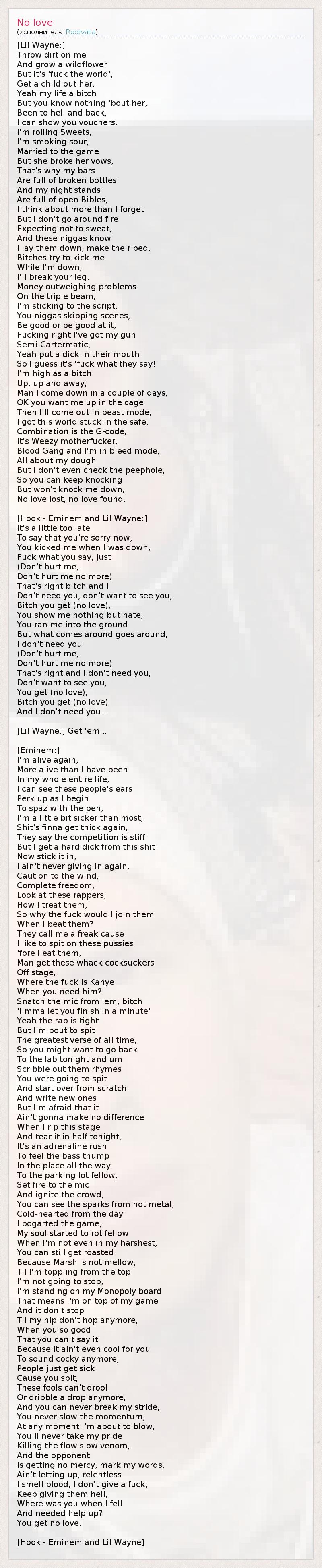 [Lil Wayne:] Throw dirt on me And grow a wildflower But it's 'fuck the world', Get a child out her, Yeah my life a bitch But you know nothing 'bout her, Been to hell and back, I can show you vouchers. I'm rolling Sweets, I'm smoking sour, Married to the game But she broke her vows, That's why my bars Are full of broken bottles And my night stands Are full of open Bibles, I think about more than I forget But I don't go around fire Expecting not to sweat, And these niggas know I lay them down, make their bed, Bitches try to kick me While I'm down, I'll break your leg. Money outweighing problems On the triple beam, I'm sticking to the script, You niggas skipping scenes, Be good or be good at it, Fucking right I've got my gun Semi-Cartermatic, Yeah put a dick in their mouth So I guess it's 'fuck what they say!' I'm high as a bitch: Up, up and away, Man I come down in a couple of days, OK you want me up in the cage Then I'll come out in beast mode, I got this world stuck in the safe, Combination is the G-code, It's Weezy motherfucker, Blood Gang and I'm in bleed mode, All about my dough But I don't even check the peephole, So you can keep knocking But won't knock me down, No love lost, no love found. [Hook - Eminem and Lil Wayne:] It's a little too late To say that you're sorry now, You kicked me when I was down, Fuck what you say, just (Don't hurt me, Don't hurt me no more) That's right bitch and I Don't need you, don't want to see you, Bitch you get (no love), You show me nothing but hate, You ran me into the ground But what comes around goes around, I don't need you (Don't hurt me, Don't hurt me no more) That's right and I don't need you, Don't want to see you, You get (no love), Bitch you get (no love) And I don't need you... [Lil Wayne:] Get 'em... [Eminem:] I'm alive again, More alive than I have been In my whole entire life, I can see these people's ears Perk up as I begin To spaz with the pen, I'm a little bit sicker than most, Shit's finna get thick again, They say the competition is stiff But I get a hard dick from this shit Now stick it in, I ain't never giving in again, Caution to the wind, Complete freedom, Look at these rappers, How I treat them, So why the fuck would I join them When I beat them? They call me a freak cause I like to spit on these pussies 'fore I eat them, Man get these whack cocksuckers Off stage, Where the fuck is Kanye When you need him? Snatch the mic from 'em, bitch 'I'mma let you finish in a minute' Yeah the rap is tight But I'm bout to spit The greatest verse of all time, So you might want to go back To the lab tonight and um Scribble out them rhymes You were going to spit And start over from scratch And write new ones But I'm afraid that it Ain't gonna make no difference When I rip this stage And tear it in half tonight, It's an adrenaline rush To feel the bass thump In the place all the way To the parking lot fellow, Set fire to the mic And ignite the crowd, You can see the sparks from hot metal, Cold-hearted from the day I bogarted the game, My soul started to rot fellow When I'm not even in my harshest, You can still get roasted Because Marsh is not mellow, Til I'm toppling from the top I'm not going to stop, I'm standing on my Monopoly board That means I'm on top of my game And it don't stop Til my hip don't hop anymore, When you so good That you can't say it Because it ain't even cool for you To sound cocky anymore, People just get sick Cause you spit, These fools can't drool Or dribble a drop anymore, And you can never break my stride, You never slow the momentum, At any moment I'm about to blow, You'll never take my pride Killing the flow slow venom, And the opponent Is getting no mercy, mark my words, Ain't letting up, relentless I smell blood, I don't give a fuck, Keep giving them hell, Where was you when I fell And needed help up? You get no love. [Hook - Eminem and Lil Wayne]
