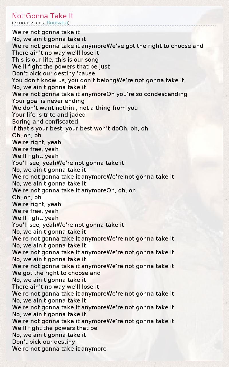 We're not gonna take it No, we ain't gonna take it We're not gonna take it anymoreWe've got the right to choose and There ain't no way we'll lose it This is our life, this is our song We'll fight the powers that be just Don't pick our destiny 'cause You don't know us, you don't belongWe're not gonna take it No, we ain't gonna take it We're not gonna take it anymoreOh you're so condescending Your goal is never ending We don't want nothin', not a thing from you Your life is trite and jaded Boring and confiscated If that's your best, your best won't doOh, oh, oh Oh, oh, oh We're right, yeah We're free, yeah We'll fight, yeah You'll see, yeahWe're not gonna take it No, we ain't gonna take it We're not gonna take it anymoreWe're not gonna take it No, we ain't gonna take it We're not gonna take it anymoreOh, oh, oh Oh, oh, oh We're right, yeah We're free, yeah We'll fight, yeah You'll see, yeahWe're not gonna take it No, we ain't gonna take it We're not gonna take it anymoreWe're not gonna take it No, we ain't gonna take it We're not gonna take it anymoreWe're not gonna take it No, we ain't gonna take it We're not gonna take it anymoreWe're not gonna take it We got the right to choose and No, we ain't gonna take it There ain't no way we'll lose it We're not gonna take it anymoreWe're not gonna take it No, we ain't gonna take it We're not gonna take it anymoreWe're not gonna take it No, we ain't gonna take it We're not gonna take it anymoreWe're not gonna take it We'll fight the powers that be No, we ain't gonna take it Don't pick our destiny We're not gonna take it anymore
