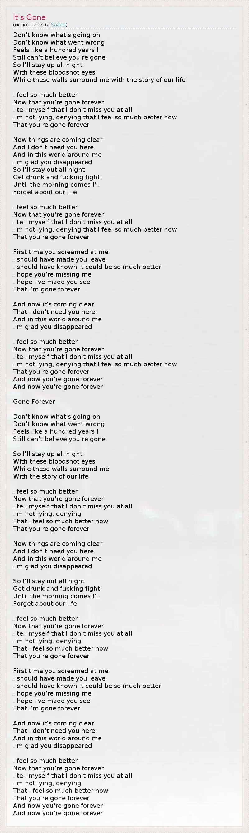 Don't know what's going on Don't know what went wrong Feels like a hundred years I Still can't believe you're gone So I'll stay up all night With these bloodshot eyes While these walls surround me with the story of our life I feel so much better Now that you're gone forever I tell myself that I don't miss you at all I'm not lying, denying that I feel so much better now That you're gone forever Now things are coming clear And I don't need you here And in this world around me I'm glad you disappeared So I'll stay out all night Get drunk and fucking fight Until the morning comes I'll Forget about our life I feel so much better Now that you're gone forever I tell myself that I don't miss you at all I'm not lying, denying that I feel so much better now That you're gone forever First time you screamed at me I should have made you leave I should have known it could be so much better I hope you're missing me I hope I've made you see That I'm gone forever And now it's coming clear That I don't need you here And in this world around me I'm glad you disappeared I feel so much better Now that you're gone forever I tell myself that I don't miss you at all I'm not lying, denying that I feel so much better now That you're gone forever And now you're gone forever And now you're gone forever Gone Forever Don't know what's going on Don't know what went wrong Feels like a hundred years I Still can't believe you're gone So I'll stay up all night With these bloodshot eyes While these walls surround me With the story of our life I feel so much better Now that you're gone forever I tell myself that I don't miss you at all I'm not lying, denying That I feel so much better now That you're gone forever Now things are coming clear And I don't need you here And in this world around me I'm glad you disappeared So I'll stay out all night Get drunk and fucking fight Until the morning comes I'll Forget about our life I feel so much better Now that you're gone forever I tell myself that I don't miss you at all I'm not lying, denying That I feel so much better now That you're gone forever First time you screamed at me I should have made you leave I should have known it could be so much better I hope you're missing me I hope I've made you see That I'm gone forever And now it's coming clear That I don't need you here And in this world around me I'm glad you disappeared I feel so much better Now that you're gone forever I tell myself that I don't miss you at all I'm not lying, denying That I feel so much better now That you're gone forever And now you're gone forever And now you're gone forever