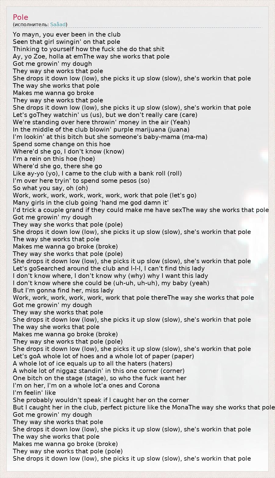 Yo mayn, you ever been in the club Seen that girl swingin' on that pole Thinking to yourself how the fuck she do that shit Ay, yo Zoe, holla at emThe way she works that pole Got me growin' my dough They way she works that pole She drops it down low (low), she picks it up slow (slow), she's workin that pole The way she works that pole Makes me wanna go broke They way she works that pole She drops it down low (low), she picks it up slow (slow), she's workin that pole Let's goThey watchin' us (us), but we don't really care (care) We're standing over here throwin' money in the air (Yeah) In the middle of the club blowin' purple marijuana (juana) I'm lookin' at this bitch but she someone's baby-mama (ma-ma) Spend some change on this hoe Where'd she go, I don't know (know) I'm a rein on this hoe (hoe) Where'd she go, there she go Like ay-yo (yo), I came to the club with a bank roll (roll) I'm over here tryin' to spend some pesos (so) So what you say, oh (oh) Work, work, work, work, work, work, work that pole (let's go) Many girls in the club going 'hand me god damn it' I'd trick a couple grand if they could make me have sexThe way she works that pole Got me growin' my dough They way she works that pole (pole) She drops it down low (low), she picks it up slow (slow), she's workin that pole The way she works that pole Makes me wanna go broke (broke) They way she works that pole (pole) She drops it down low (low), she picks it up slow (slow), she's workin that pole Let's goSearched around the club and I-I-I, I can't find this lady I don't know where, I don't know why (why) why I want this lady I don't know where she could be (uh-uh, uh-uh), my baby (yeah) But I'm gonna find her, miss lady Work, work, work, work, work, work that pole thereThe way she works that pole Got me growin' my dough They way she works that pole She drops it down low (low), she picks it up slow (slow), she's workin that pole The way she works that pole Makes me wanna go broke (broke) They way she works that pole (pole) She drops it down low (low), she picks it up slow (slow), she's workin that pole Let's goA whole lot of hoes and a whole lot of paper (paper) A whole lot of ice equals up to all the haters (haters) A whole lot of niggaz standin' in this one corner (corner) One bitch on the stage (stage), so who the fuck want her I'm on her, I'm on a whole lot'a ones and Corona I'm feelin' like She probably wouldn't speak if I caught her on the corner But I caught her in the club, perfect picture like the MonaThe way she works that pole Got me growin' my dough They way she works that pole She drops it down low (low), she picks it up slow (slow), she's workin that pole The way she works that pole Makes me wanna go broke (broke) They way she works that pole (pole) She drops it down low (low), she picks it up slow (slow), she's workin that pole