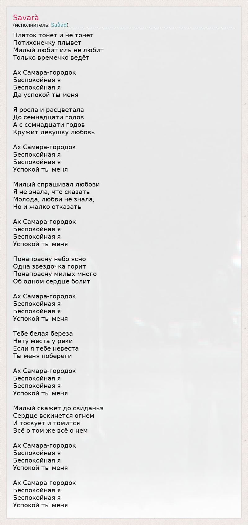 Платок тонет и не тонет Потихонечку плывет Милый любит иль не любит Только времечко ведёт Ах Самара-городок Беспокойная я Беспокойная я Да успокой ты меня Я росла и расцветала До семнадцати годов А с семнадцати годов Кружит девушку любовь Ах Самара-городок Беспокойная я Беспокойная я Успокой ты меня Милый спрашивал любови Я не знала, что сказать Молода, любви не знала, Но и жалко отказать Ах Самара-городок Беспокойная я Беспокойная я Успокой ты меня Понапрасну небо ясно Одна звездочка горит Понапрасну милых много Об одном сердце болит Ах Самара-городок Беспокойная я Беспокойная я Успокой ты меня Тебе белая береза Нету места у реки Если я тебе невеста Ты меня побереги Ах Самара-городок Беспокойная я Беспокойная я Успокой ты меня Милый скажет до свиданья Сердце вскинется огнем И тоскует и томится Всё о том же всё о нем Ах Самара-городок Беспокойная я Беспокойная я Успокой ты меня Ах Самара-городок Беспокойная я Беспокойная я Успокой ты меня