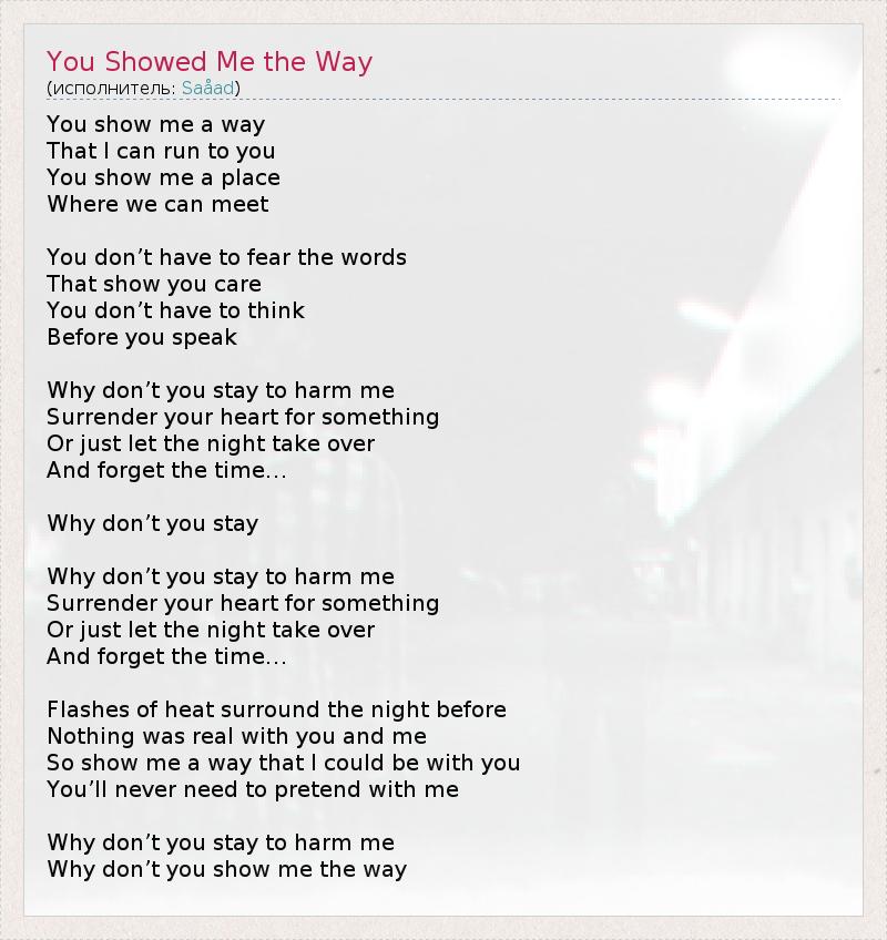 You show me a way That I can run to you You show me a place Where we can meet You don’t have to fear the words That show you care You don’t have to think Before you speak Why don’t you stay to harm me Surrender your heart for something Or just let the night take over And forget the time… Why don’t you stay Why don’t you stay to harm me Surrender your heart for something Or just let the night take over And forget the time… Flashes of heat surround the night before Nothing was real with you and me So show me a way that I could be with you You’ll never need to pretend with me Why don’t you stay to harm me Why don’t you show me the way