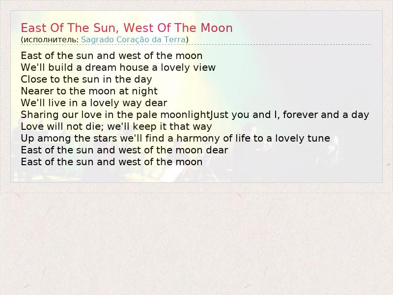East of the sun and west of the moon We'll build a dream house a lovely view Close to the sun in the day Nearer to the moon at night We'll live in a lovely way dear Sharing our love in the pale moonlightJust you and I, forever and a day Love will not die; we'll keep it that way Up among the stars we'll find a harmony of life to a lovely tune East of the sun and west of the moon dear East of the sun and west of the moon