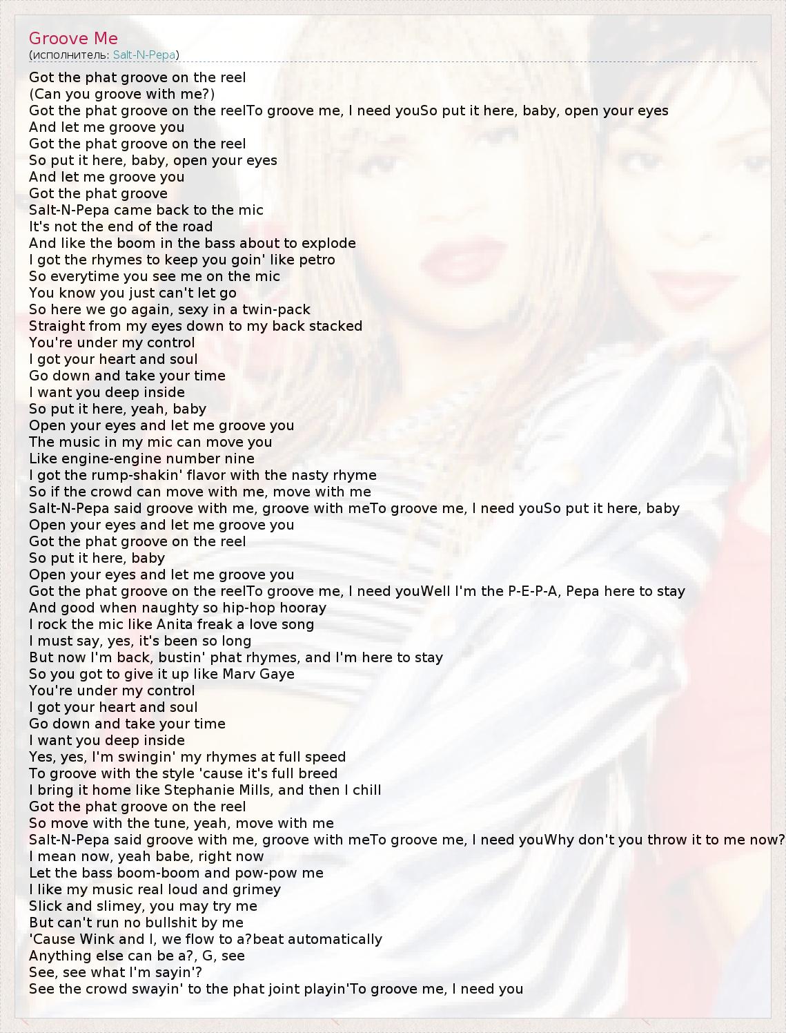 Salt-N-Pepa said groove with me, groove with meTo groove me, I need youSo put it here, baby