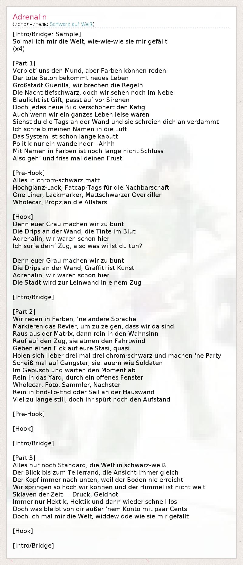 [Intro/Bridge: Sample] So mal ich mir die Welt, wie-wie-wie sie mir gefällt (x4) [Part 1] Verbiet’ uns den Mund, aber Farben können reden Der tote Beton bekommt neues Leben Großstadt Guerilla, wir brechen die Regeln Die Nacht tiefschwarz, doch wir sehen noch im Nebel Blaulicht ist Gift, passt auf vor Sirenen Doch jedes neue Bild verschönert den Käfig Auch wenn wir ein ganzes Leben leise waren Siehst du die Tags an der Wand und sie schreien dich an verdammt Ich schreib meinen Namen in die Luft Das System ist schon lange kaputt Politik nur ein wandelnder - Ahhh Mit Namen in Farben ist noch lange nicht Schluss Also geh’ und friss mal deinen Frust [Pre-Hook] Alles in chrom-schwarz matt Hochglanz-Lack, Fatcap-Tags für die Nachbarschaft One Liner, Lackmarker, Mattschwarzer Overkiller Wholecar, Propz an die Allstars [Hook] Denn euer Grau machen wir zu bunt Die Drips an der Wand, die Tinte im Blut Adrenalin, wir waren schon hier Ich surfe dein’ Zug, also was willst du tun? Denn euer Grau machen wir zu bunt Die Drips an der Wand, Graffiti ist Kunst Adrenalin, wir waren schon hier Die Stadt wird zur Leinwand in einem Zug [Intro/Bridge] [Part 2] Wir reden in Farben, 'ne andere Sprache Markieren das Revier, um zu zeigen, dass wir da sind Raus aus der Matrix, dann rein in den Wahnsinn Rauf auf den Zug, sie atmen den Fahrtwind Geben einen Fick auf eure Stasi, quasi Holen sich lieber drei mal drei chrom-schwarz und machen 'ne Party Scheiß mal auf Gangster, sie lauern wie Soldaten Im Gebüsch und warten den Moment ab Rein in das Yard, durch ein offenes Fenster Wholecar, Foto, Sammler, Nächster Rein in End-To-End oder Seil an der Hauswand Viel zu lange still, doch ihr spürt noch den Aufstand [Pre-Hook] [Hook] [Intro/Bridge] [Part 3] Alles nur noch Standard, die Welt in schwarz-weiß Der Blick bis zum Tellerrand, die Ansicht immer gleich Der Kopf immer nach unten, weil der Boden nie erreicht Wir springen so hoch wir können und der Himmel ist nicht weit Sklaven der Zeit — Druck, Geldnot Immer nur Hektik, Hektik und dann wieder schnell los Doch was bleibt von dir außer 'nem Konto mit paar Cents Doch ich mal mir die Welt, widdewidde wie sie mir gefällt [Hook] [Intro/Bridge]