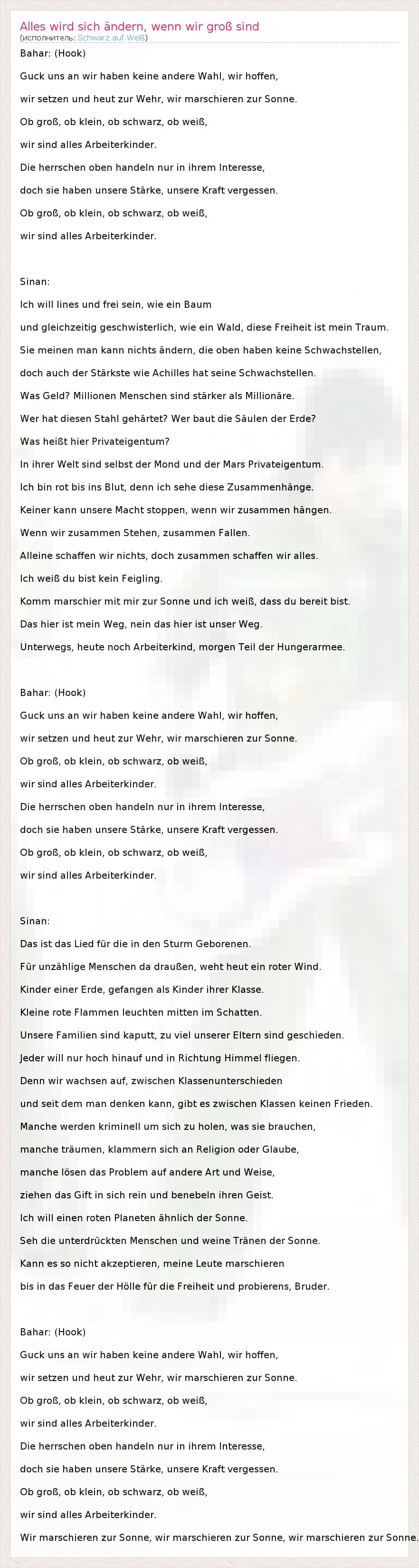 Bahar: (Hook) Guck uns an wir haben keine andere Wahl, wir hoffen, wir setzen und heut zur Wehr, wir marschieren zur Sonne. Ob groß, ob klein, ob schwarz, ob weiß, wir sind alles Arbeiterkinder. Die herrschen oben handeln nur in ihrem Interesse, doch sie haben unsere Stärke, unsere Kraft vergessen. Ob groß, ob klein, ob schwarz, ob weiß, wir sind alles Arbeiterkinder. Sinan: Ich will lines und frei sein, wie ein Baum und gleichzeitig geschwisterlich, wie ein Wald, diese Freiheit ist mein Traum. Sie meinen man kann nichts ändern, die oben haben keine Schwachstellen, doch auch der Stärkste wie Achilles hat seine Schwachstellen. Was Geld? Millionen Menschen sind stärker als Millionäre. Wer hat diesen Stahl gehärtet? Wer baut die Säulen der Erde? Was heißt hier Privateigentum? In ihrer Welt sind selbst der Mond und der Mars Privateigentum. Ich bin rot bis ins Blut, denn ich sehe diese Zusammenhänge. Keiner kann unsere Macht stoppen, wenn wir zusammen hängen. Wenn wir zusammen Stehen, zusammen Fallen. Alleine schaffen wir nichts, doch zusammen schaffen wir alles. Ich weiß du bist kein Feigling. Komm marschier mit mir zur Sonne und ich weiß, dass du bereit bist. Das hier ist mein Weg, nein das hier ist unser Weg. Unterwegs, heute noch Arbeiterkind, morgen Teil der Hungerarmee. Bahar: (Hook) Guck uns an wir haben keine andere Wahl, wir hoffen, wir setzen und heut zur Wehr, wir marschieren zur Sonne. Ob groß, ob klein, ob schwarz, ob weiß, wir sind alles Arbeiterkinder. Die herrschen oben handeln nur in ihrem Interesse, doch sie haben unsere Stärke, unsere Kraft vergessen. Ob groß, ob klein, ob schwarz, ob weiß, wir sind alles Arbeiterkinder. Sinan: Das ist das Lied für die in den Sturm Geborenen. Für unzählige Menschen da draußen, weht heut ein roter Wind. Kinder einer Erde, gefangen als Kinder ihrer Klasse. Kleine rote Flammen leuchten mitten im Schatten. Unsere Familien sind kaputt, zu viel unserer Eltern sind geschieden. Jeder will nur hoch hinauf und in Richtung Himmel fliegen. Denn wir wachsen auf, zwischen Klassenunterschieden und seit dem man denken kann, gibt es zwischen Klassen keinen Frieden. Manche werden kriminell um sich zu holen, was sie brauchen, manche träumen, klammern sich an Religion oder Glaube, manche lösen das Problem auf andere Art und Weise, ziehen das Gift in sich rein und benebeln ihren Geist. Ich will einen roten Planeten ähnlich der Sonne. Seh die unterdrückten Menschen und weine Tränen der Sonne. Kann es so nicht akzeptieren, meine Leute marschieren bis in das Feuer der Hölle für die Freiheit und probierens, Bruder. Bahar: (Hook) Guck uns an wir haben keine andere Wahl, wir hoffen, wir setzen und heut zur Wehr, wir marschieren zur Sonne. Ob groß, ob klein, ob schwarz, ob weiß, wir sind alles Arbeiterkinder. Die herrschen oben handeln nur in ihrem Interesse, doch sie haben unsere Stärke, unsere Kraft vergessen. Ob groß, ob klein, ob schwarz, ob weiß, wir sind alles Arbeiterkinder. Wir marschieren zur Sonne, wir marschieren zur Sonne, wir marschieren zur Sonne.