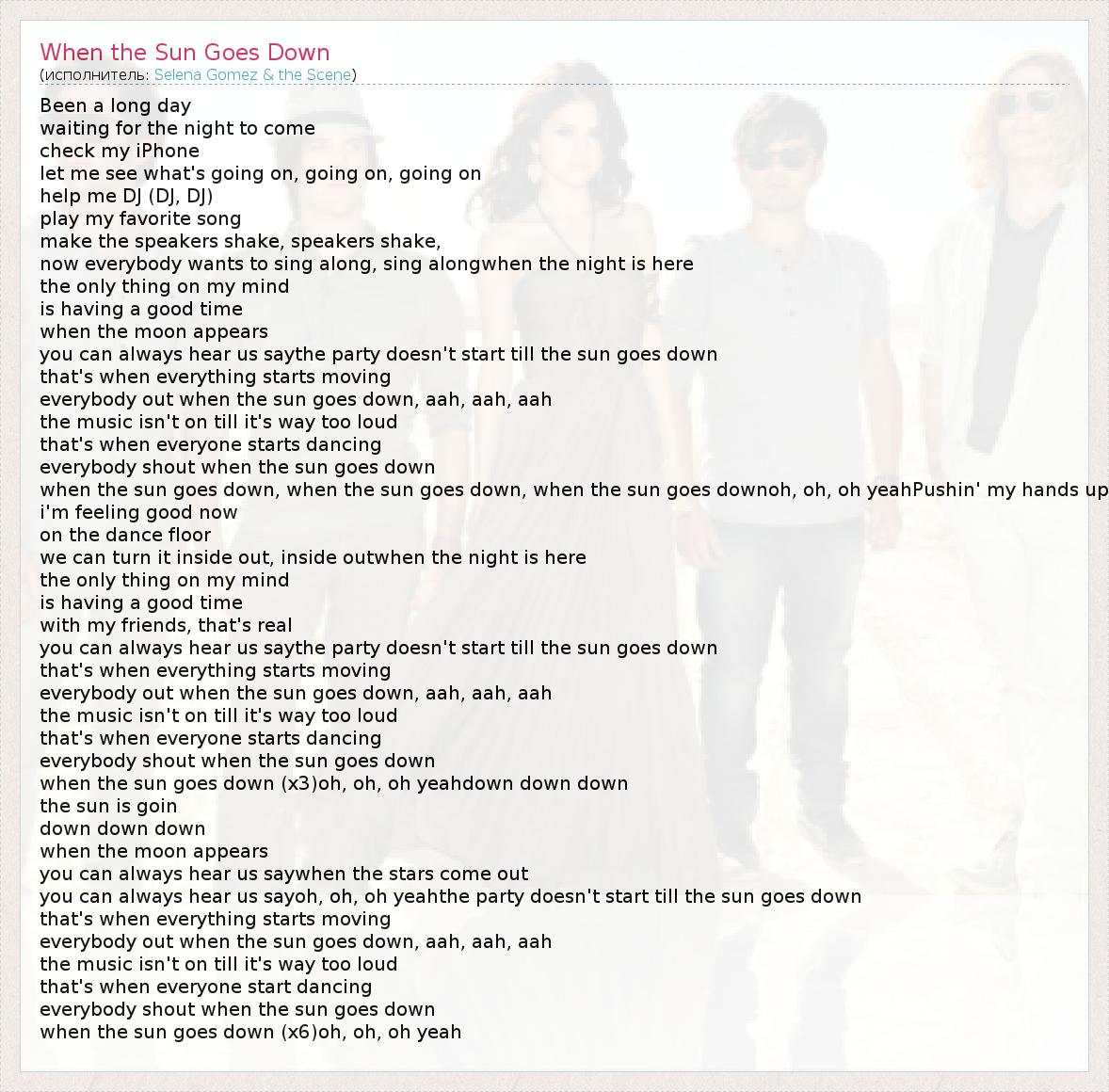 Been a long day waiting for the night to come check my iPhone let me see what's going on, going on, going on help me DJ (DJ, DJ) play my favorite song make the speakers shake, speakers shake, now everybody wants to sing along, sing alongwhen the night is here the only thing on my mind is having a good time when the moon appears you can always hear us saythe party doesn't start till the sun goes down that's when everything starts moving everybody out when the sun goes down, aah, aah, aah the music isn't on till it's way too loud that's when everyone starts dancing everybody shout when the sun goes down when the sun goes down, when the sun goes down, when the sun goes downoh, oh, oh yeahPushin' my hands up i'm feeling good now on the dance floor we can turn it inside out, inside outwhen the night is here the only thing on my mind is having a good time with my friends, that's real you can always hear us saythe party doesn't start till the sun goes down that's when everything starts moving everybody out when the sun goes down, aah, aah, aah the music isn't on till it's way too loud that's when everyone starts dancing everybody shout when the sun goes down when the sun goes down (x3)oh, oh, oh yeahdown down down the sun is goin down down down when the moon appears you can always hear us saywhen the stars come out you can always hear us sayoh, oh, oh yeahthe party doesn't start till the sun goes down that's when everything starts moving everybody out when the sun goes down, aah, aah, aah the music isn't on till it's way too loud that's when everyone start dancing everybody shout when the sun goes down when the sun goes down (x6)oh, oh, oh yeah