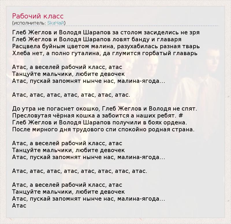Глеб Жеглов и Володя Шарапов за столом засиделись не зря Глеб Жеглов и Володя Шарапов ловят банду и главаря Расцвела буйным цветом малина, разухабилась разная тварь Хлеба нет, а полно гуталина, да глумится горбатый главарь Атас, а веселей рабочий класс, атас Танцуйте мальчики, любите девочек Атас, пускай запомнят нынче нас, малина-ягода… Атас, атас, атас, атас, атас, атас, атас. До утра не погаснет окошко, Глеб Жеглов и Володя не спят. Пресловутая чёрная кошка а забоится а наших ребят. # Глеб Жеглов и Володя Шарапов получили в боях ордена. После мирного дня трудового спи спокойно родная страна. Атас, а веселей рабочий класс, атас Танцуйте мальчики, любите девочек Атас, пускай запомнят нынче нас, малина-ягода… Атас, атас, атас, атас, атас, атас, атас, атас. Атас, а веселей рабочий класс, атас Танцуйте мальчики, любите девочек Атас, пускай запомнят нынче нас, малина-ягода… Атас