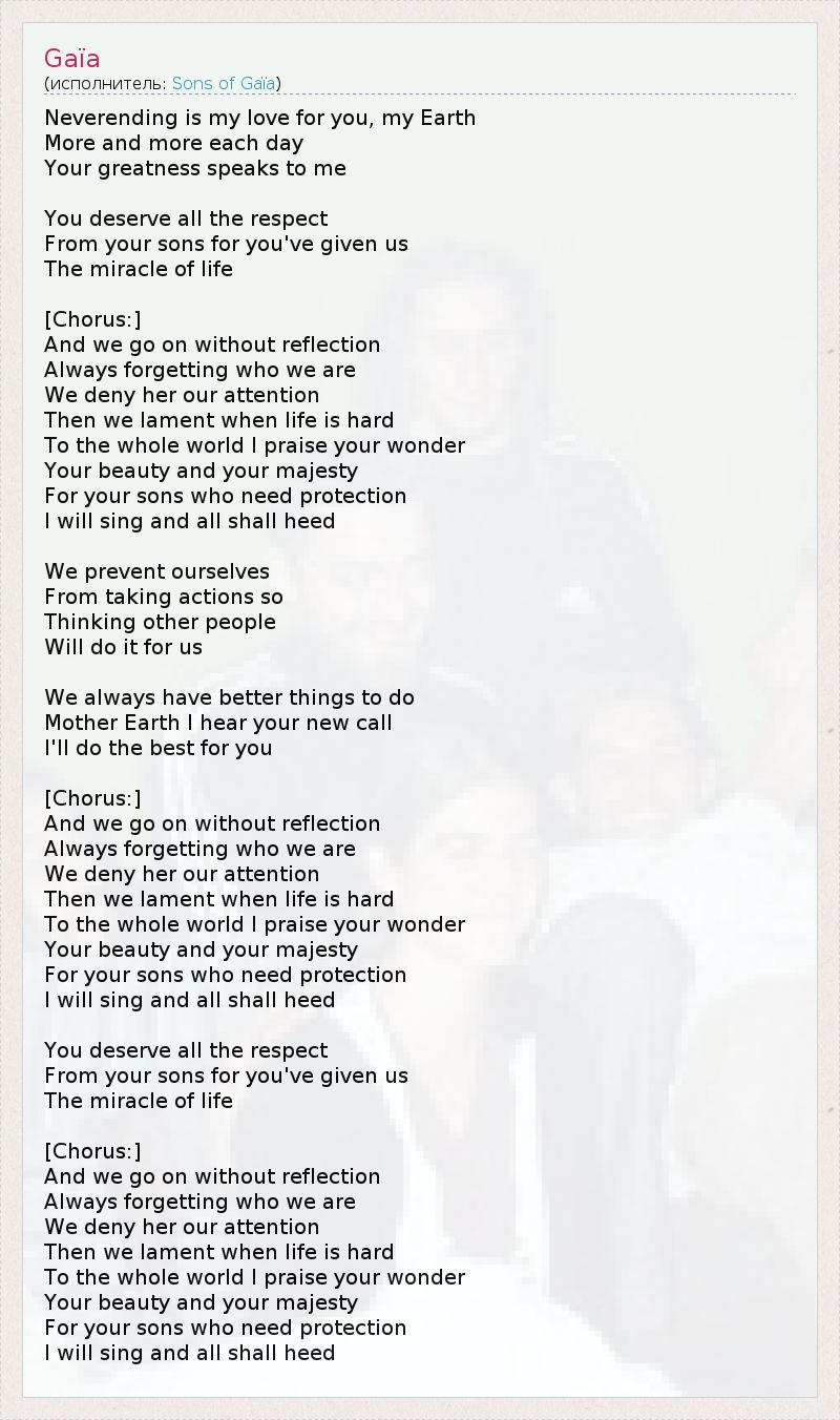 Neverending is my love for you, my Earth More and more each day Your greatness speaks to me You deserve all the respect From your sons for you've given us The miracle of life [Chorus:] And we go on without reflection Always forgetting who we are We deny her our attention Then we lament when life is hard To the whole world I praise your wonder Your beauty and your majesty For your sons who need protection I will sing and all shall heed We prevent ourselves From taking actions so Thinking other people Will do it for us We always have better things to do Mother Earth I hear your new call I'll do the best for you [Chorus:] And we go on without reflection Always forgetting who we are We deny her our attention Then we lament when life is hard To the whole world I praise your wonder Your beauty and your majesty For your sons who need protection I will sing and all shall heed You deserve all the respect From your sons for you've given us The miracle of life [Chorus:] And we go on without reflection Always forgetting who we are We deny her our attention Then we lament when life is hard To the whole world I praise your wonder Your beauty and your majesty For your sons who need protection I will sing and all shall heed