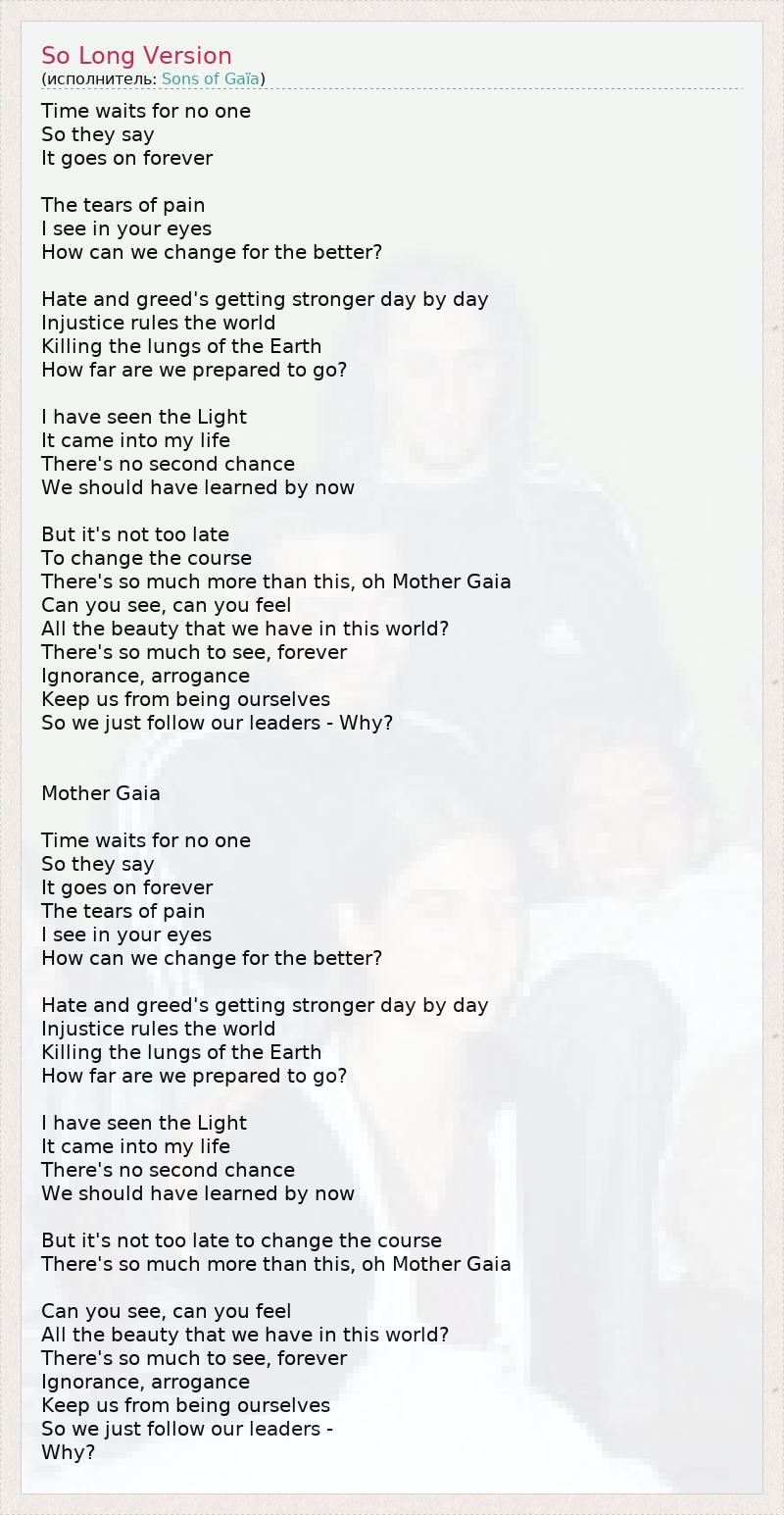Time waits for no one So they say It goes on forever The tears of pain I see in your eyes How can we change for the better? Hate and greed's getting stronger day by day Injustice rules the world Killing the lungs of the Earth How far are we prepared to go? I have seen the Light It came into my life There's no second chance We should have learned by now But it's not too late To change the course There's so much more than this, oh Mother Gaia Can you see, can you feel All the beauty that we have in this world? There's so much to see, forever Ignorance, arrogance Keep us from being ourselves So we just follow our leaders - Why? Mother Gaia Time waits for no one So they say It goes on forever The tears of pain I see in your eyes How can we change for the better? Hate and greed's getting stronger day by day Injustice rules the world Killing the lungs of the Earth How far are we prepared to go? I have seen the Light It came into my life There's no second chance We should have learned by now But it's not too late to change the course There's so much more than this, oh Mother Gaia Can you see, can you feel All the beauty that we have in this world? There's so much to see, forever Ignorance, arrogance Keep us from being ourselves So we just follow our leaders - Why?