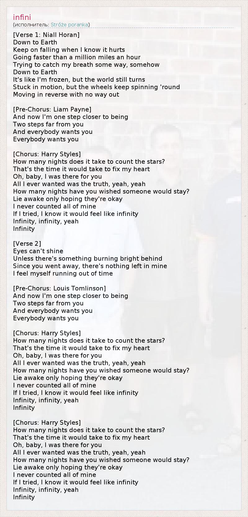 [Куплет 1: Niall Horan] Расставшись с иллюзиями, Я продолжаю мечтать, осознавая боль грез. 1 С небес на землю лечу со скоростью больше миллиона миль в час, Пытаясь хоть как-то, хоть чуть-чуть, перевести дух. Расставшись с иллюзиями, Я словно замер, но мир по-прежнему вертится. Застыл в движении, но колеса продолжают крутиться, Двигаться в обратном направлении, не имея другого выхода. [Распевка: Liam Payne] И вот, я на один шаг ближе, чтобы быть На два шага дальше от тебя. И каждый хочет тебя, Каждый хочет тебя. [Припев: Harry Styles] Сколько ночей потребуется для того, чтобы сосчитать звезды? Столько же времени нужно, чтобы исцелить мое сердце. О, детка, я был рядом с тобой И я хотел только лишь правду, да, даа. Сколько ночей ты желаешь, чтобы кто-то остался с тобой? Лежишь, не смыкая глаз, надеясь лишь на то, что с этим человеком все будет хорошо. Я никогда не считал, сколько ночей надеялся я. Но знаю, если бы попытался, то понял, что их бесконечное множество. Бесконечность, бесконечность, даа. Бесконечность. [Куплет 2:] Глаза не могут блестеть, Пока что-то не загорится ярко в них. Когда ты ушла, ничего не осталось в моих глазах. Я чувствую, что мне не хватает времени. [Распевка: Liam Payne] И вот я на один шаг ближе, чтобы быть На два шага дальше от тебя. И каждый хочет тебя, Каждый хочет тебя. [Припев: Harry Styles] Сколько ночей потребуется для того, чтобы сосчитать звезды? Столько же времени нужно, чтобы исцелить мое сердце. О, детка, я был рядом с тобой И я хотел только лишь правду, да, даа. Сколько ночей ты желаешь, чтобы кто-то остался с тобой? Лежишь, не смыкая глаз, надеясь лишь на то, что с этим человеком все будет хорошо. Я никогда не считал, сколько ночей надеялся я. Но знаю, если бы попытался, то понял, что их бесконечное множество. Бесконечность, бесконечность, даа. Бесконечность. Припев: Harry Styles] Сколько ночей потребуется для того, чтобы сосчитать звезды? Столько же времени нужно, чтобы исцелить мое сердце. О, детка, я был рядом с тобой И я хотел только лишь правду, да, даа. Сколько ночей ты желаешь, чтобы кто-то остался с тобой? Лежишь, не смыкая глаз, надеясь лишь на то, что с этим человеком все будет хорошо. Я никогда не считал, сколько ночей надеялся я. Но знаю, если бы попытался, то понял, что их бесконечное множество. Бесконечность, бесконечность, даа. Бесконечность. 1 – Фраза «down to earth» означает «реалистический», «не питающий иллюзий», «стоящий ногами на земле». Исполнитель говорит, что он спустился с небес на землю, т.е. столкнулся с реальностью. Говоря, что «он продолжает падать» (keep on falling), он понимает, что падение ни к чему хорошему не приведет, принесёт лишь боль. Получается, столкнувшись с реальностью (упав на землю), а значит, не питая иллюзий, исполнитель всё равно мечтает (продолжает падать), но эти мечты пусты и в будущем причинят ему только боль. Иллюзия, мечта, грезы – это все синонимы. Дальше, говоря, что он падает с большой скоростью, исполнитель подчеркивает, как быстро развеиваются его мечты и что реальность совсем другая.