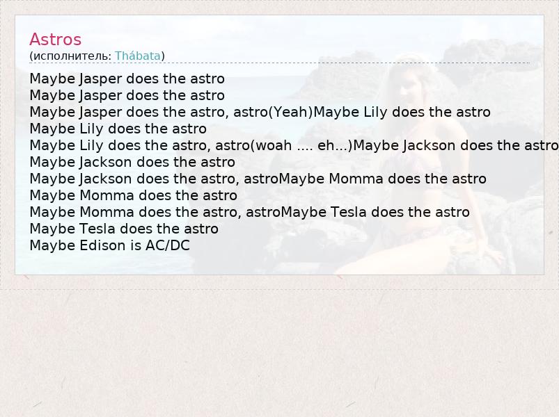 Maybe Jasper does the astro Maybe Jasper does the astro Maybe Jasper does the astro, astro(Yeah)Maybe Lily does the astro Maybe Lily does the astro Maybe Lily does the astro, astro(woah .... eh...)Maybe Jackson does the astro Maybe Jackson does the astro Maybe Jackson does the astro, astroMaybe Momma does the astro Maybe Momma does the astro Maybe Momma does the astro, astroMaybe Tesla does the astro Maybe Tesla does the astro Maybe Edison is AC/DC