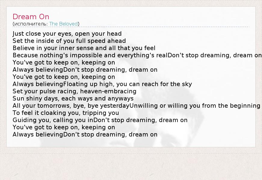 Just close your eyes, open your head Set the inside of you full speed ahead Believe in your inner sense and all that you feel Because nothing's impossible and everything's realDon't stop dreaming, dream on You've got to keep on, keeping on Always believingDon't stop dreaming, dream on You've got to keep on, keeping on Always believingFloating up high, you can reach for the sky Set your pulse racing, heaven-embracing Sun shiny days, each ways and anyways All your tomorrows, bye, bye yesterdayUnwilling or willing you from the beginning To feel it cloaking you, tripping you Guiding you, calling you inDon't stop dreaming, dream on You've got to keep on, keeping on Always believingDon't stop dreaming, dream on