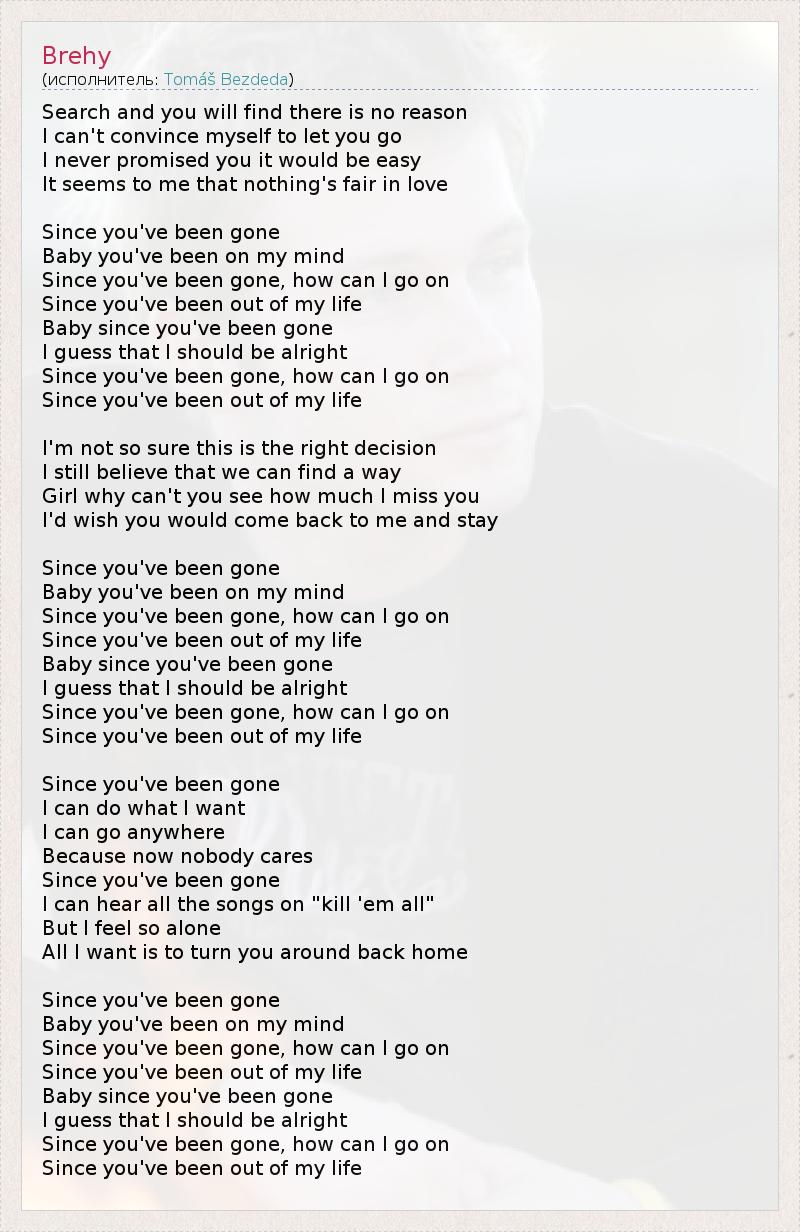 Search and you will find there is no reason I can't convince myself to let you go I never promised you it would be easy It seems to me that nothing's fair in love Since you've been gone Baby you've been on my mind Since you've been gone, how can I go on Since you've been out of my life Baby since you've been gone I guess that I should be alright Since you've been gone, how can I go on Since you've been out of my life I'm not so sure this is the right decision I still believe that we can find a way Girl why can't you see how much I miss you I'd wish you would come back to me and stay Since you've been gone Baby you've been on my mind Since you've been gone, how can I go on Since you've been out of my life Baby since you've been gone I guess that I should be alright Since you've been gone, how can I go on Since you've been out of my life Since you've been gone I can do what I want I can go anywhere Because now nobody cares Since you've been gone I can hear all the songs on "kill 'em all" But I feel so alone All I want is to turn you around back home Since you've been gone Baby you've been on my mind Since you've been gone, how can I go on Since you've been out of my life Baby since you've been gone I guess that I should be alright Since you've been gone, how can I go on Since you've been out of my life