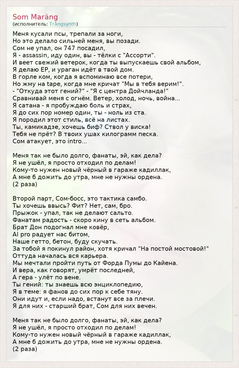 Меня кусали псы, трепали за ноги, Но это делало сильней меня, вы позади. Сом не упал, он 747 посадил, Я - assassin, иду один, вы - тёлки с "Ассорти". И веет свежий ветерок, когда ты выпускаешь свой альбом, Я делаю EP, и ураган идёт в твой дом. В горле ком, когда я вспоминаю все потери, Но жму на tape, когда мне кричат "Мы в тебя верим!". - "Откуда этот гений?" - "Я с центра Дойчланда!" Сравнивай меня с огнём. Ветер, холод, ночь, война... Я сатана - я пробуждаю боль и страх, Я до сих пор номер один, ты - ноль из ста. Я породил этот стиль, всё на листах. Ты, камикадзе, хочешь биф? Ствол у виска! Тебя не прёт? В твоих ушах килограмм песка. Сом атакует, это intro... Меня так не было долго, фанаты, эй, как дела? Я не ушёл, я просто отходил по делам! Кому-то нужен новый чёрный в гараже кадиллак, А мне б дожить до утра, мне не нужны ордена. (2 раза) Второй парт, Сом-босс, это тактика самбо. Ты хочешь ввысь? Фит? Нет, сам, бро. Прыжок - упал, так не делают сальто. Фанатам радость - скоро кину в сеть альбом. Брат Дон подогнал мне ковёр, Al pro радует нас битом, Наше гетто, бетон, буду скучать. За тобой я покинул район, хотя кричал "На постой мостовой!" Оттуда началась вся карьера. Мы мечтали пройти путь от Форда Пумы до Кайена. И вера, как говорят, умрёт последней, А гера - улёт по вене. Ты гений: ты знаешь всю энциклопедию, Я в теме: я фанов до сих пор к себе тяну. Они идут и, если надо, встанут все за плечи. Я для них - старший брат, Сом для них вечен. Меня так не было долго, фанаты, эй, как дела? Я не ушёл, я просто отходил по делам! Кому-то нужен новый чёрный в гараже кадиллак, А мне б дожить до утра, мне не нужны ордена. (2 раза)
