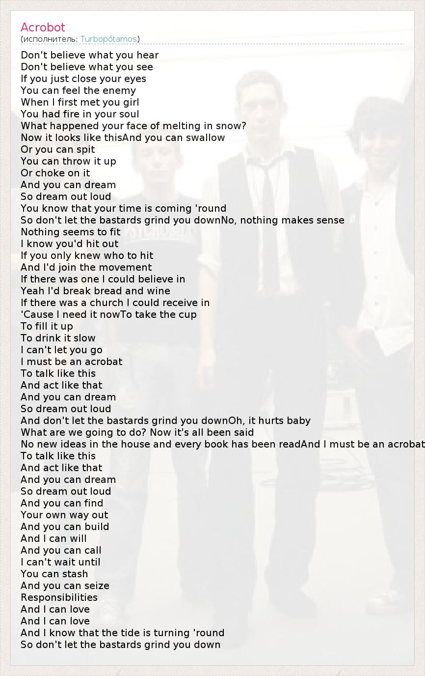 Don't believe what you hear Don't believe what you see If you just close your eyes You can feel the enemy When I first met you girl You had fire in your soul What happened your face of melting in snow? Now it looks like thisAnd you can swallow Or you can spit You can throw it up Or choke on it And you can dream So dream out loud You know that your time is coming 'round So don't let the bastards grind you downNo, nothing makes sense Nothing seems to fit I know you'd hit out If you only knew who to hit And I'd join the movement If there was one I could believe in Yeah I'd break bread and wine If there was a church I could receive in 'Cause I need it nowTo take the cup To fill it up To drink it slow I can't let you go I must be an acrobat To talk like this And act like that And you can dream So dream out loud And don't let the bastards grind you downOh, it hurts baby What are we going to do? Now it's all been said No new ideas in the house and every book has been readAnd I must be an acrobat To talk like this And act like that And you can dream So dream out loud And you can find Your own way out And you can build And I can will And you can call I can't wait until You can stash And you can seize Responsibilities And I can love And I can love And I know that the tide is turning 'round So don't let the bastards grind you down
