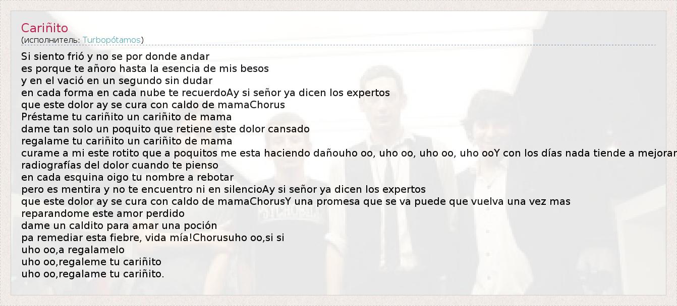 Si siento frió y no se por donde andar es porque te añoro hasta la esencia de mis besos y en el vació en un segundo sin dudar en cada forma en cada nube te recuerdoAy si señor ya dicen los expertos que este dolor ay se cura con caldo de mamaChorus Préstame tu cariñito un cariñito de mama dame tan solo un poquito que retiene este dolor cansado regalame tu cariñito un cariñito de mama curame a mi este rotito que a poquitos me esta haciendo dañouho oo, uho oo, uho oo, uho ooY con los días nada tiende a mejorar radiografías del dolor cuando te pienso en cada esquina oigo tu nombre a rebotar pero es mentira y no te encuentro ni en silencioAy si señor ya dicen los expertos que este dolor ay se cura con caldo de mamaChorusY una promesa que se va puede que vuelva una vez mas reparandome este amor perdido dame un caldito para amar una poción pa remediar esta fiebre, vida mía!Chorusuho oo,si si uho oo,a regalamelo uho oo,regaleme tu cariñito uho oo,regalame tu cariñito.