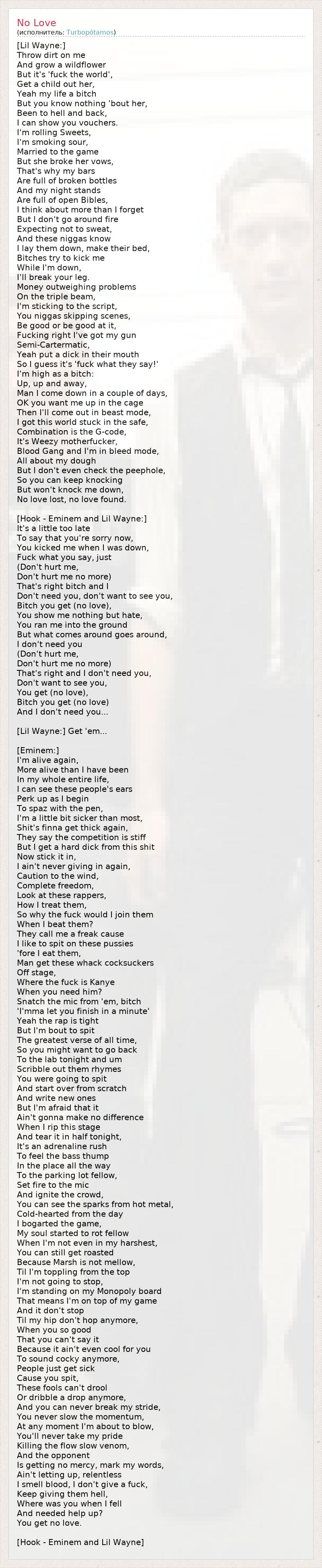 [Lil Wayne:] Throw dirt on me And grow a wildflower But it's 'fuck the world', Get a child out her, Yeah my life a bitch But you know nothing 'bout her, Been to hell and back, I can show you vouchers. I'm rolling Sweets, I'm smoking sour, Married to the game But she broke her vows, That's why my bars Are full of broken bottles And my night stands Are full of open Bibles, I think about more than I forget But I don't go around fire Expecting not to sweat, And these niggas know I lay them down, make their bed, Bitches try to kick me While I'm down, I'll break your leg. Money outweighing problems On the triple beam, I'm sticking to the script, You niggas skipping scenes, Be good or be good at it, Fucking right I've got my gun Semi-Cartermatic, Yeah put a dick in their mouth So I guess it's 'fuck what they say!' I'm high as a bitch: Up, up and away, Man I come down in a couple of days, OK you want me up in the cage Then I'll come out in beast mode, I got this world stuck in the safe, Combination is the G-code, It's Weezy motherfucker, Blood Gang and I'm in bleed mode, All about my dough But I don't even check the peephole, So you can keep knocking But won't knock me down, No love lost, no love found. [Hook - Eminem and Lil Wayne:] It's a little too late To say that you're sorry now, You kicked me when I was down, Fuck what you say, just (Don't hurt me, Don't hurt me no more) That's right bitch and I Don't need you, don't want to see you, Bitch you get (no love), You show me nothing but hate, You ran me into the ground But what comes around goes around, I don't need you (Don't hurt me, Don't hurt me no more) That's right and I don't need you, Don't want to see you, You get (no love), Bitch you get (no love) And I don't need you... [Lil Wayne:] Get 'em... [Eminem:] I'm alive again, More alive than I have been In my whole entire life, I can see these people's ears Perk up as I begin To spaz with the pen, I'm a little bit sicker than most, Shit's finna get thick again, They say the competition is stiff But I get a hard dick from this shit Now stick it in, I ain't never giving in again, Caution to the wind, Complete freedom, Look at these rappers, How I treat them, So why the fuck would I join them When I beat them? They call me a freak cause I like to spit on these pussies 'fore I eat them, Man get these whack cocksuckers Off stage, Where the fuck is Kanye When you need him? Snatch the mic from 'em, bitch 'I'mma let you finish in a minute' Yeah the rap is tight But I'm bout to spit The greatest verse of all time, So you might want to go back To the lab tonight and um Scribble out them rhymes You were going to spit And start over from scratch And write new ones But I'm afraid that it Ain't gonna make no difference When I rip this stage And tear it in half tonight, It's an adrenaline rush To feel the bass thump In the place all the way To the parking lot fellow, Set fire to the mic And ignite the crowd, You can see the sparks from hot metal, Cold-hearted from the day I bogarted the game, My soul started to rot fellow When I'm not even in my harshest, You can still get roasted Because Marsh is not mellow, Til I'm toppling from the top I'm not going to stop, I'm standing on my Monopoly board That means I'm on top of my game And it don't stop Til my hip don't hop anymore, When you so good That you can't say it Because it ain't even cool for you To sound cocky anymore, People just get sick Cause you spit, These fools can't drool Or dribble a drop anymore, And you can never break my stride, You never slow the momentum, At any moment I'm about to blow, You'll never take my pride Killing the flow slow venom, And the opponent Is getting no mercy, mark my words, Ain't letting up, relentless I smell blood, I don't give a fuck, Keep giving them hell, Where was you when I fell And needed help up? You get no love. [Hook - Eminem and Lil Wayne]