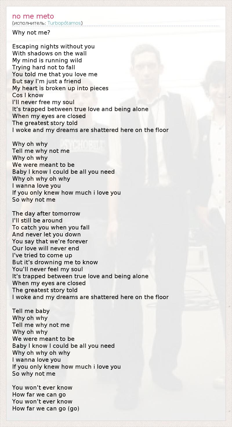 Почему же не я? Проносятся ночи без тебя, Ночи с тенями на стенах. Я теряю рассудок, Пытаюсь сдержаться. Ты говорила, что любишь, Но говоришь, что я просто друг, Моё сердце разбито на куски, Потому что я знаю, Моя душа не освободиться. Это западня между настоящей любовью и одиночеством. Когда я закрываю глаза, Передними прекрасная картина. Но я просыпаюсь и мои сны тут же разбиваются о пол. Почему же? Почему же? Скажи почему же не я? Почему же? Почему же? Нам хорошо было вместе Малыш, я знаю, что мог бы быть идеальным для тебя Я должен любить тебя Если б только знала как люблю Ну почему же не я? Утро перетекает в день. Я всё равно буду рядом, Что бы поймать, если ты оступишься, И не дать тебе упасть. Ты говорила что мы вечны, И любовь наша бесконечна. Я пытался убежать от этого, Но спотыкался, зная, Что ты никогда не поймёшь меня. Это западня между настоящей любовью и одиночеством. Когда я закрываю глаза, Передними прекрасная картина. Но я просыпаюсь и мои сны тут же разбиваются о пол. Почему же? Почему же? Скажи почему же не я? Почему же? Почему же? Нам хорошо было вместе Малыш, я знаю, что мог бы быть идеальным для тебя Я должен любить тебя Если б только знала как люблю Ну почему же не я? Ты даже не узнаешь Как далеко мы могли бы зайти Ты даже не узнаешь Как далеко мы могли бы зайти
