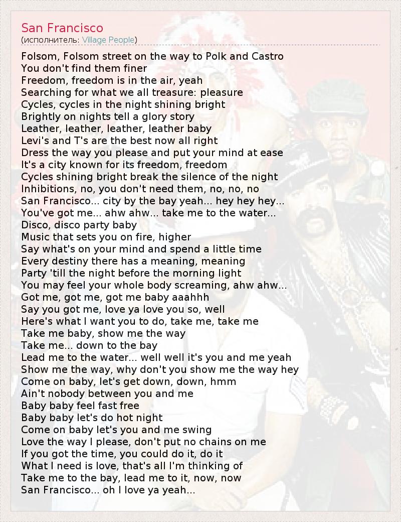 Folsom, Folsom street on the way to Polk and Castro You don't find them finer Freedom, freedom is in the air, yeah Searching for what we all treasure: pleasure Cycles, cycles in the night shining bright Brightly on nights tell a glory story Leather, leather, leather, leather baby Levi's and T's are the best now all right Dress the way you please and put your mind at ease It's a city known for its freedom, freedom Cycles shining bright break the silence of the night Inhibitions, no, you don't need them, no, no, no San Francisco... city by the bay yeah... hey hey hey... You've got me... ahw ahw... take me to the water... Disco, disco party baby Music that sets you on fire, higher Say what's on your mind and spend a little time Every destiny there has a meaning, meaning Party 'till the night before the morning light You may feel your whole body screaming, ahw ahw... Got me, got me, got me baby aaahhh Say you got me, love ya love you so, well Here's what I want you to do, take me, take me Take me baby, show me the way Take me... down to the bay Lead me to the water... well well it's you and me yeah Show me the way, why don't you show me the way hey Come on baby, let's get down, down, hmm Ain't nobody between you and me Baby baby feel fast free Baby baby let's do hot night Come on baby let's you and me swing Love the way I please, don't put no chains on me If you got the time, you could do it, do it What I need is love, that's all I'm thinking of Take me to the bay, lead me to it, now, now San Francisco... oh I love ya yeah...