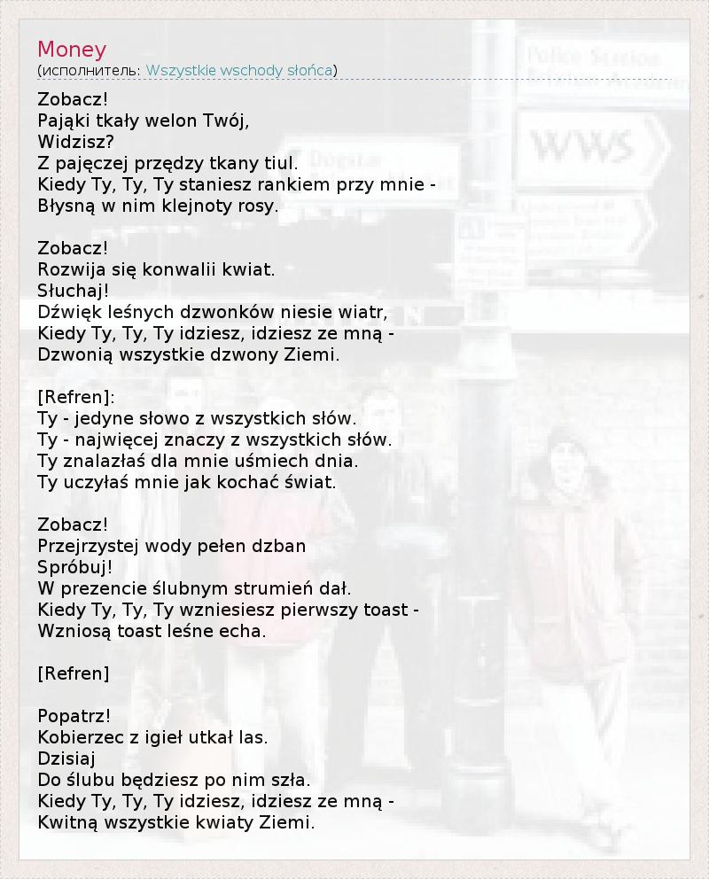 Zobacz! Pająki tkały welon Twój, Widzisz? Z pajęczej przędzy tkany tiul. Kiedy Ty, Ty, Ty staniesz rankiem przy mnie - Błysną w nim klejnoty rosy. Zobacz! Rozwija się konwalii kwiat. Słuchaj! Dźwięk leśnych dzwonków niesie wiatr, Kiedy Ty, Ty, Ty idziesz, idziesz ze mną - Dzwonią wszystkie dzwony Ziemi. [Refren]: Ty - jedyne słowo z wszystkich słów. Ty - najwięcej znaczy z wszystkich słów. Ty znalazłaś dla mnie uśmiech dnia. Ty uczyłaś mnie jak kochać świat. Zobacz! Przejrzystej wody pełen dzban Spróbuj! W prezencie ślubnym strumień dał. Kiedy Ty, Ty, Ty wzniesiesz pierwszy toast - Wzniosą toast leśne echa. [Refren] Popatrz! Kobierzec z igieł utkał las. Dzisiaj Do ślubu będziesz po nim szła. Kiedy Ty, Ty, Ty idziesz, idziesz ze mną - Kwitną wszystkie kwiaty Ziemi.