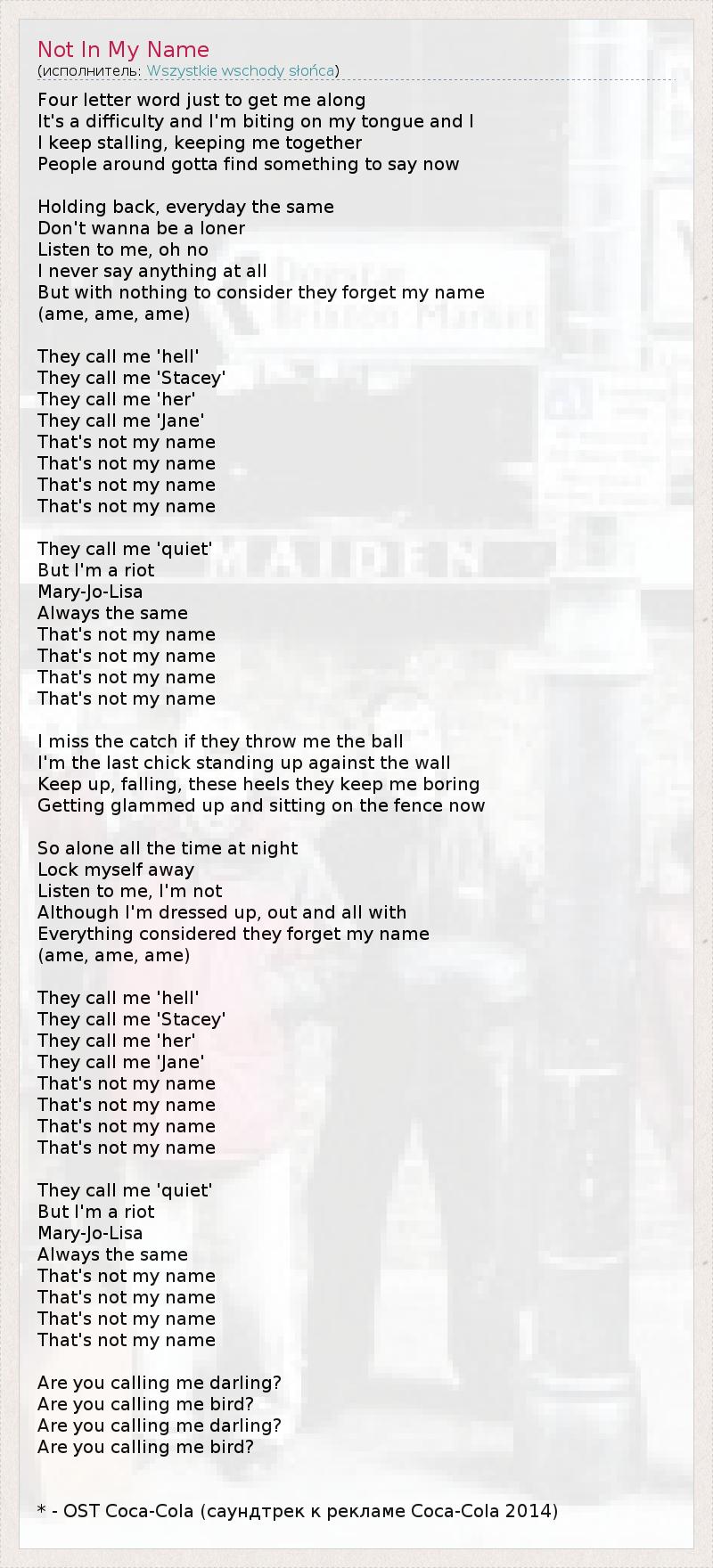 Four letter word just to get me along It's a difficulty and I'm biting on my tongue and I I keep stalling, keeping me together People around gotta find something to say now Holding back, everyday the same Don't wanna be a loner Listen to me, oh no I never say anything at all But with nothing to consider they forget my name (ame, ame, ame) They call me 'hell' They call me 'Stacey' They call me 'her' They call me 'Jane' That's not my name That's not my name That's not my name That's not my name They call me 'quiet' But I'm a riot Mary-Jo-Lisa Always the same That's not my name That's not my name That's not my name That's not my name I miss the catch if they throw me the ball I'm the last chick standing up against the wall Keep up, falling, these heels they keep me boring Getting glammed up and sitting on the fence now So alone all the time at night Lock myself away Listen to me, I'm not Although I'm dressed up, out and all with Everything considered they forget my name (ame, ame, ame) They call me 'hell' They call me 'Stacey' They call me 'her' They call me 'Jane' That's not my name That's not my name That's not my name That's not my name They call me 'quiet' But I'm a riot Mary-Jo-Lisa Always the same That's not my name That's not my name That's not my name That's not my name Are you calling me darling? Are you calling me bird? Are you calling me darling? Are you calling me bird? * - OST Coca-Cola (саундтрек к рекламе Coca-Cola 2014)
