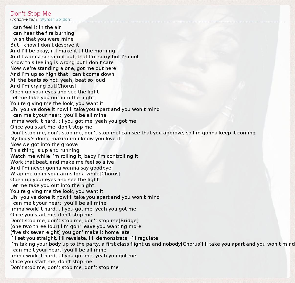 I can feel it in the air I can hear the fire burning I wish that you were mine But I know I don't deserve it And I'll be okay, if I make it til the morning And I wanna scream it out, that I'm sorry but I'm not Know this feeling is wrong but I don't care Now we're standing alone, got me out here And I'm up so high that I can't come down All the beats so hot, yeah, beat so loud And I'm crying out[Chorus] Open up your eyes and see the light Let me take you out into the night You're giving me the look, you want it Uh! you've done it nowI'll take you apart and you won't mind I can melt your heart, you'll be all mine Imma work it hard, til you got me, yeah you got me Once you start me, don't stop me Don't stop me, don't stop me, don't stop meI can see that you approve, so I'm gonna keep it coming My body's doing maximum i know you love it Now we got into the groove This thing is up and running Watch me while I'm rolling it, baby I'm controlling it Work that beat, and make me feel so alive And I'm never gonna wanna say goodbye Wrap me up in your arms for a while[Chorus] Open up your eyes and see the light Let me take you out into the night You're giving me the look, you want it Uh! you've done it nowI'll take you apart and you won't mind I can melt your heart, you'll be all mine Imma work it hard, til you got me, yeah you got me Once you start me, don't stop me Don't stop me, don't stop me, don't stop me[Bridge] (one two three four) I'm gon' leave you wanting more (five six seven eight) you gon' make it home late I'll set you straight, I'll revelate, I'll demonstrate, I'll regulate I'm taking your body up to the party, a first class flight us and nobody[Chorus]I'll take you apart and you won't mind I can melt your heart, you'll be all mine Imma work it hard, til you got me, yeah you got me Once you start me, don't stop me Don't stop me, don't stop me, don't stop me