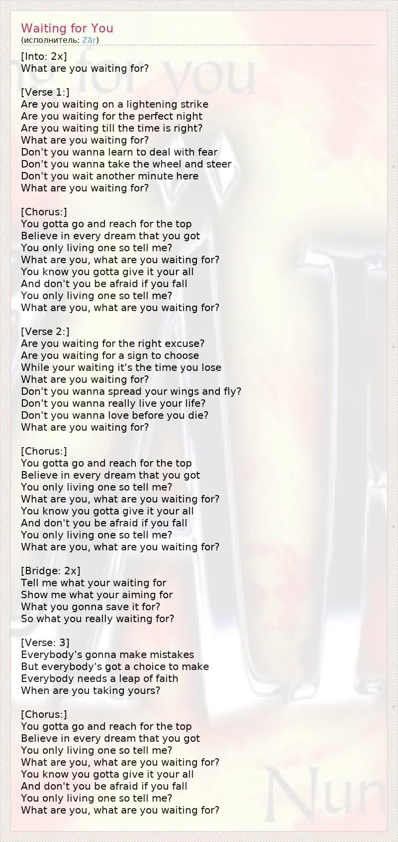 [Into: 2х] What are you waiting for? [Verse 1:] Are you waiting on a lightening strike Are you waiting for the perfect night Are you waiting till the time is right? What are you waiting for? Don't you wanna learn to deal with fear Don't you wanna take the wheel and steer Don't you wait another minute here What are you waiting for? [Chorus:] You gotta go and reach for the top Believe in every dream that you got You only living one so tell me? What are you, what are you waiting for? You know you gotta give it your all And don't you be afraid if you fall You only living one so tell me? What are you, what are you waiting for? [Verse 2:] Are you waiting for the right excuse? Are you waiting for a sign to choose While your waiting it's the time you lose What are you waiting for? Don't you wanna spread your wings and fly? Don't you wanna really live your life? Don't you wanna love before you die? What are you waiting for? [Chorus:] You gotta go and reach for the top Believe in every dream that you got You only living one so tell me? What are you, what are you waiting for? You know you gotta give it your all And don't you be afraid if you fall You only living one so tell me? What are you, what are you waiting for? [Bridge: 2x] Tell me what your waiting for Show me what your aiming for What you gonna save it for? So what you really waiting for? [Verse: 3] Everybody's gonna make mistakes But everybody's got a choice to make Everybody needs a leap of faith When are you taking yours? [Chorus:] You gotta go and reach for the top Believe in every dream that you got You only living one so tell me? What are you, what are you waiting for? You know you gotta give it your all And don't you be afraid if you fall You only living one so tell me? What are you, what are you waiting for?
