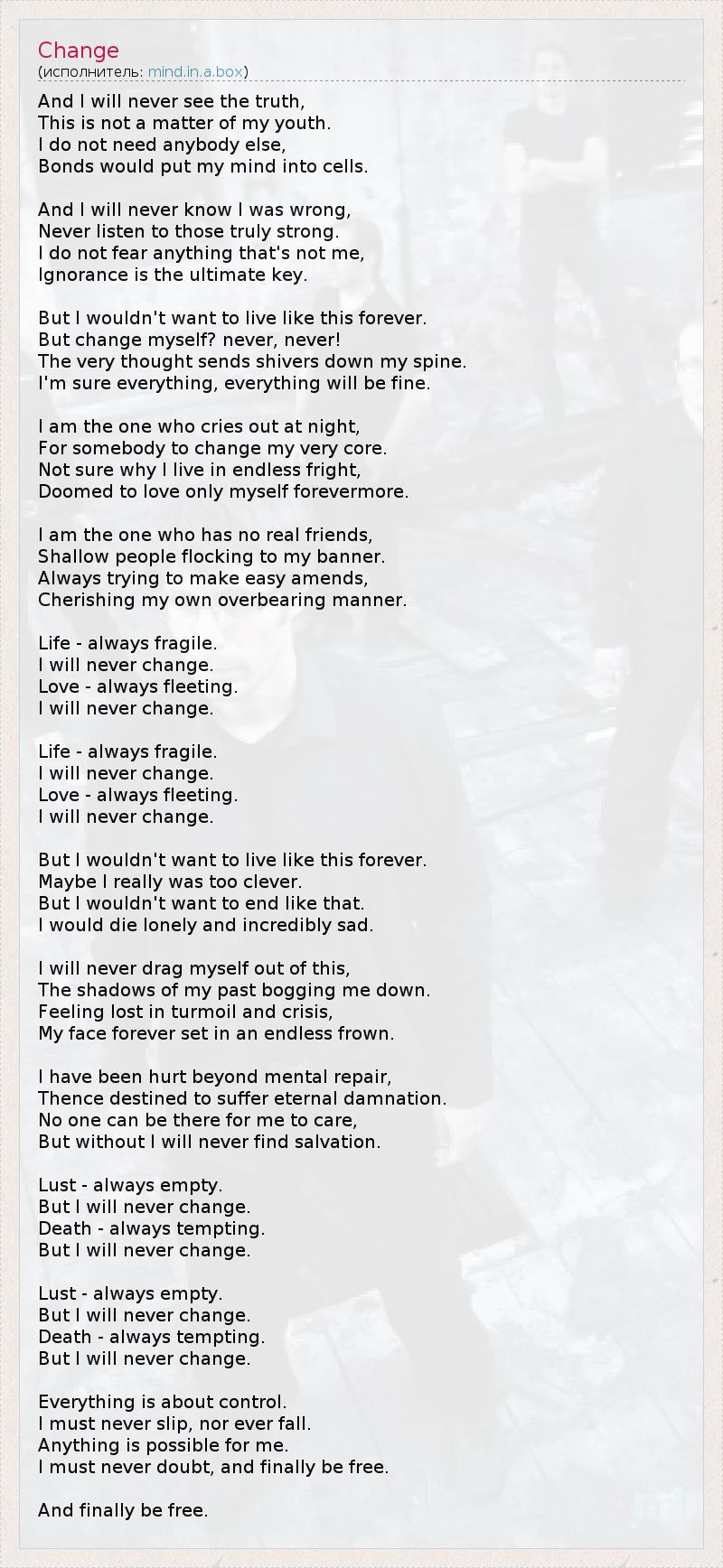 Я никогда не узнаю правду, И это не дело моей юности. Мне просто никто не нужен, Иначе мой разум будет заперт в клетке. И я никогда не пойму, что был не прав, Никогда не слушайте тех, кто по-настоящему силен. Я не боюсь никого, кроме себя, Незнание - ключ ко всему. Но я не хотел бы жить так вечно. Но изменить себя? Да никогда, никогда! Из-за самой мысли об этом у меня бегут мурашки. Я уверен, что все, все будет хорошо. Я - тот, кто кричит по ночам Тому, кто сможет изменить саму мою сущность. Не знаю, почему я живу в бесконечном страхе, Обреченный всегда любить только себя. Я - тот, у кого нет настоящий друзей, Лишь мелкие люди собираются у моего знамени. Всегда пытаюсь что-то легко исправить, Храня свой собственный властный характер. Жизнь - всегда хрупка. Я никогда не изменюсь. Жизнь - всегда мимолетна. Я никогда не изменюсь. Жизнь - всегда хрупка. Я никогда не изменюсь. Жизнь - всегда мимолетна. Я никогда не изменюсь. Но я не хотел бы жить так вечно. Может, потому, что я был слишком умен. Но я не хотел бы, чтобы все закончилось так. Я умру, полный одиночества и грусти. Я никогда не буду терзать себя из-за этого, Тени моего прошлого тянут меня вниз. Чувствую себя потерянным во всей этой суматохе и кризисе, А лицо мое осталось навеки хмурым. Я был ранен за моим ментальным восстановлением, Мне суждено страдать от вечного проклятия. Для меня там нет никого, кому не все равно, Но без этого я никогда не найду спасения. Похоть - всегда пуста. Но я никогда не изменюсь. Смерть - всегда заманчива. Но я никогда не изменюсь. Похоть - всегда пуста. Но я никогда не изменюсь. Смерть - всегда заманчива. Но я никогда не изменюсь. Все сводится к контролю. Я никогда не должен спотыкаться, не должен падать. Все возможно для меня. Я никогда не должен сомневаться - и тогда, наконец, стану свободным. Тогда, наконец, стану свободным.