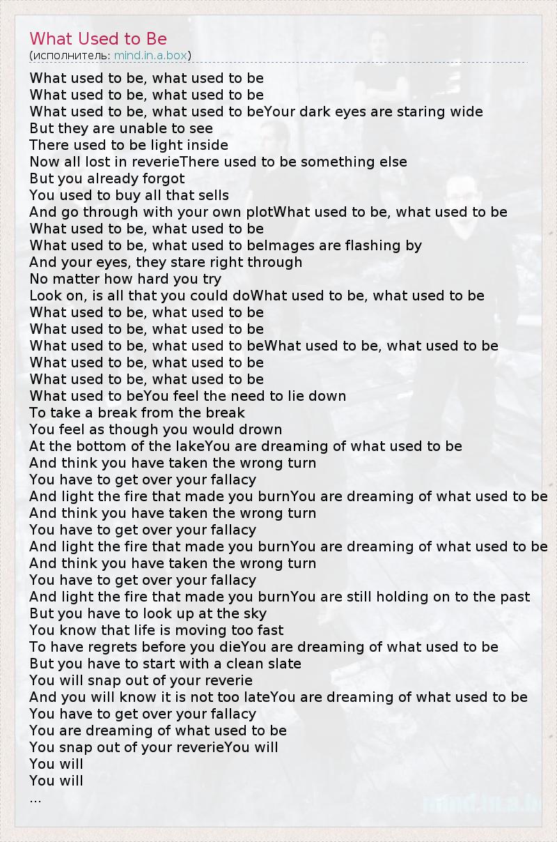What used to be, what used to be What used to be, what used to be What used to be, what used to beYour dark eyes are staring wide But they are unable to see There used to be light inside Now all lost in reverieThere used to be something else But you already forgot You used to buy all that sells And go through with your own plotWhat used to be, what used to be What used to be, what used to be What used to be, what used to beImages are flashing by And your eyes, they stare right through No matter how hard you try Look on, is all that you could doWhat used to be, what used to be What used to be, what used to be What used to be, what used to be What used to be, what used to beWhat used to be, what used to be What used to be, what used to be What used to be, what used to be What used to beYou feel the need to lie down To take a break from the break You feel as though you would drown At the bottom of the lakeYou are dreaming of what used to be And think you have taken the wrong turn You have to get over your fallacy And light the fire that made you burnYou are dreaming of what used to be And think you have taken the wrong turn You have to get over your fallacy And light the fire that made you burnYou are dreaming of what used to be And think you have taken the wrong turn You have to get over your fallacy And light the fire that made you burnYou are still holding on to the past But you have to look up at the sky You know that life is moving too fast To have regrets before you dieYou are dreaming of what used to be But you have to start with a clean slate You will snap out of your reverie And you will know it is not too lateYou are dreaming of what used to be You have to get over your fallacy You are dreaming of what used to be You snap out of your reverieYou will You will You will ...