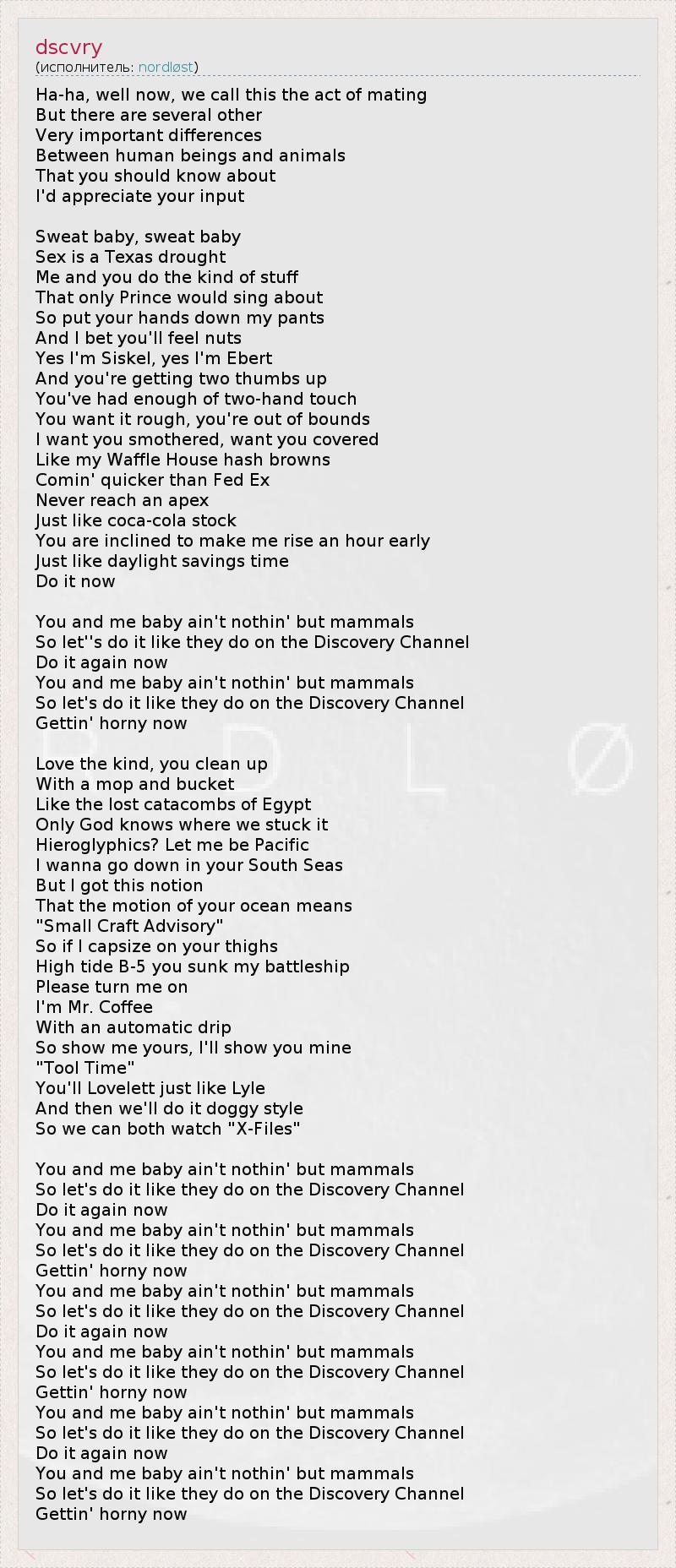 Ха-ха. Ну, ладно, мы называем этот акт спариванием. Но есть и ряд других Очень важных различий Между людьми и животными, О которых вам следует знать. Я буду вам благодарен за вклад в это дело. Потей, детка, потей, детка. Секс – это техасская засуха. Ты и я делаем то, О чём только Принц стал бы петь. Поэтому засунь руки мне под брюки. Спорим, ты нащупаешь яйца. Да, я Сискел, да, я Эберт, И ты мне говоришь, что всё просто супер. Я уже достаточно трогал тебя двумя руками, Ты хочешь грубости, ты необузданна. Я хочу задушить тебя, наброситься на тебя сверху, Как на чипсы Уэфл Хаус. Я кончу быстрее, чем служба по доставке ФедЭкс выполнит 1заказ. Я никогда не растягиваю удовольствие, Как запас кока-колы. Обычно ты заставляешь меня вставать на час раньше, Словно переведя время на час вперёд. Так сделай это сейчас. Детка, ты и я – те же самые млекопитающие. Поэтому, давай будем делать это так, как показывают на канале Дискавери, Снова и снова. Детка, ты и я – те же самые млекопитающие. Поэтому, давай будем делать это так, как показывают на канале Дискавери, Возбудись. Боже, ты убираешься С ведром и шваброй Словно в затерянных катакомбах в Египте. Бог один знает, куда мы их подевали. Иероглифы? Я хочу быть Тихим Океаном, Я хочу утонуть в твоих Южных морях. Но мне кажется, Что движение в твоём океане означает «Предупреждение маленькому судну». Поэтому если я опрокину на твои бёдра Высокую волну, ты потопишь мой линкор. Пожалуйста, заведи меня. Я – Мистер Кофе С автоматическим розливом. Покажи мне «свою», а я покажу тебе «свой». «Время инструментов», Тебе это понравится, как и Лайл. А затем мы это сделаем в догги-стайл, Чтобы мы оба могли посмотреть «Х-Files». Детка, ты и я – те же самые млекопитающие. Поэтому, давай будем делать это так, как показывают на канале Дискавери. Снова и снова. Детка, ты и я – те же самые млекопитающие. Поэтому, давай будем делать это так, как показывают на канале Дискавери, Возбудись. Детка, ты и я – те же самые млекопитающие. Поэтому, давай будем делать это так, как показывают на канале Дискавери. Снова и снова. Детка, ты и я – те же самые млекопитающие. Поэтому, давай будем делать это так, как показывают на канале Дискавери, Возбудись. Детка, ты и я – те же самые млекопитающие. Поэтому, давай будем делать это так, как показывают на канале Дискавери. Снова и снова. Детка, ты и я – те же самые млекопитающие. Поэтому, давай будем делать это так, как показывают на канале Дискавери, Возбудись.
