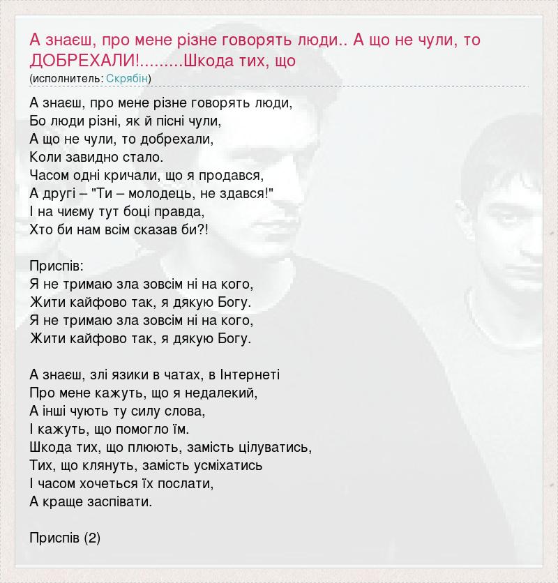 Главная→Исполнители→Скрябін→А знаєш, про мене різне говорять люди.. А що не чули, то ДОБРЕХАЛИ!.....